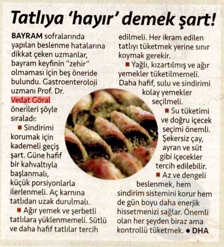 Ramazan boyunca vücudun daha az ve seyrek öğünlere alıştığını hatırlatan Prof. Göral, “Uzun süre aç kalan mideyi bayram sabahında bir anda ağır yiyeceklerle doldurmak sindirim sistemini zorlar. Güne hafif bir kahvaltıyla başlanmalı, küçük porsiyonlarla ilerlenmelidir. Bayramda yapılan hatalardan biri de aç karnına tatlı yemek. Kan şekerinde ani yükselme ve düşüşlere neden oluyor bu da terleme, halsizlik, çarpıntı ve mide bulantısı gibi şikâyetlere yol açabilir. Tatlı mutlaka yemekten sonra, mümkünse 30 dakika ile 1 saat arasında tüketilmelidir” diye konuştu.