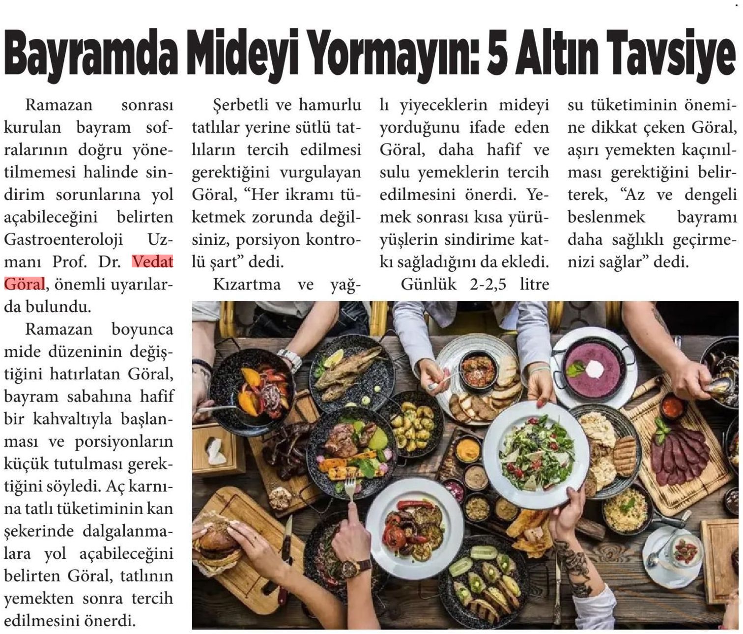 Ramazan sonrası kurulan bayram sofraları, doğru yönetilmezse mide ve bağırsaklarda sorunlara yol açabiliyor. Medipol Sağlık Grubu’ndan Gastroenteroloji Uzmanı Prof. Dr. Vedat Göral, bayramda yapılan beslenme hatalarına dikkat çekerek sağlıklı bir bayram için önemli uyarılarda bulundu.