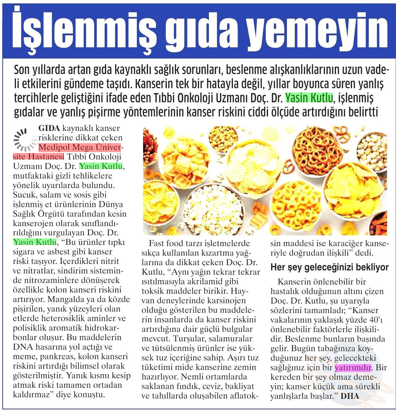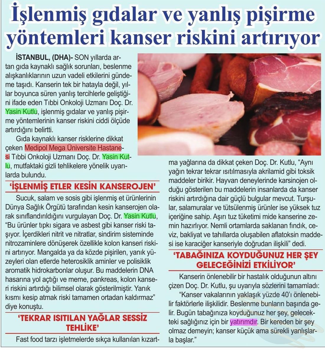 Sucuk, salam ve sosis gibi işlenmiş et ürünlerinin Dünya Sağlık Örgütü tarafından kesin kanserojen olarak sınıflandırıldığını vurgulayan Doç. Dr. Yasin Kutlu, “Bu ürünler tıpkı sigara ve asbest gibi kanser riski taşıyor. İçerdikleri nitrit ve nitratlar, sindirim sisteminde nitrozaminlere dönüşerek özellikle kolon kanseri riskini artırıyor. Mangalda ya da közde pişirilen, yanık yüzeyleri olan etlerde heterosiklik aminler ve polisiklik aromatik hidrokarbonlar oluşur. Bu maddelerin DNA hasarına yol açtığı ve meme, pankreas, kolon kanseri riskini artırdığı bilimsel olarak gösterilmiştir. Yanık kısmı kesip atmak riski tamamen ortadan kaldırmaz” diye konuştu.