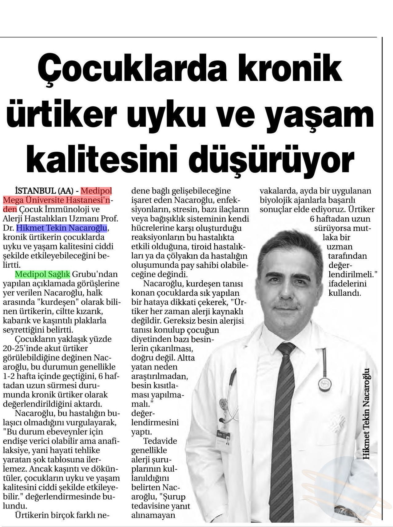 Kurdeşen tanısı konan çocuklarda sık yapılan bir hataya da dikkat çeken Prof. Nacaroğlu, “Ürtiker her zaman alerji kaynaklı değildir. Gereksiz besin alerjisi tanısı konulup çocuğun diyetinden bazı besinlerin çıkarılması doğru değildir. Altta yatan neden araştırılmadan besin kısıtlaması yapılmamalı” uyarısında bulundu. Tedavide genellikle alerji şuruplarının kullanıldığını belirten Prof. Nacaroğlu, “Şurup tedavisine yanıt alınamayan vakalarda ayda bir uygulanan biyolojik ajanlarla başarılı sonuçlar elde ediyoruz. Ürtiker 6 haftadan uzun sürüyorsa mutlaka bir uzman tarafından değerlendirilmelidir” şeklinde konuştu.