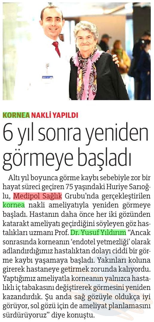 Başarılı operasyonun ardından yeniden görmeye başlayan Huriye Sarıoğlu ise yaşadığı mutluluğu şu sözlerle anlattı: “Gözümdeki kornea tabakasının bozulması sonucu yaklaşık 6 yıldır görmüyordum. Bu süreçte çok zor günler geçirdim, ciddi psikolojik sıkıntılar yaşadım. Tavsiye üzerine Prof. Dr. Yusuf Yıldırım’a geldik. Yapılan ameliyatla yeniden ışığa kavuştum. Bugün çok mutluyum, adeta hayata yeniden geldim. Bir organ, bir hayat demek. Ben bugün görebiliyorsam bu bağışlar sayesinde. Herkesten organ ve kornea bağışına duyarlı olmasını istiyorum. Umarım sesimizi duyurabiliriz”