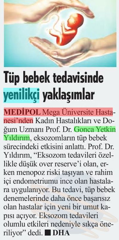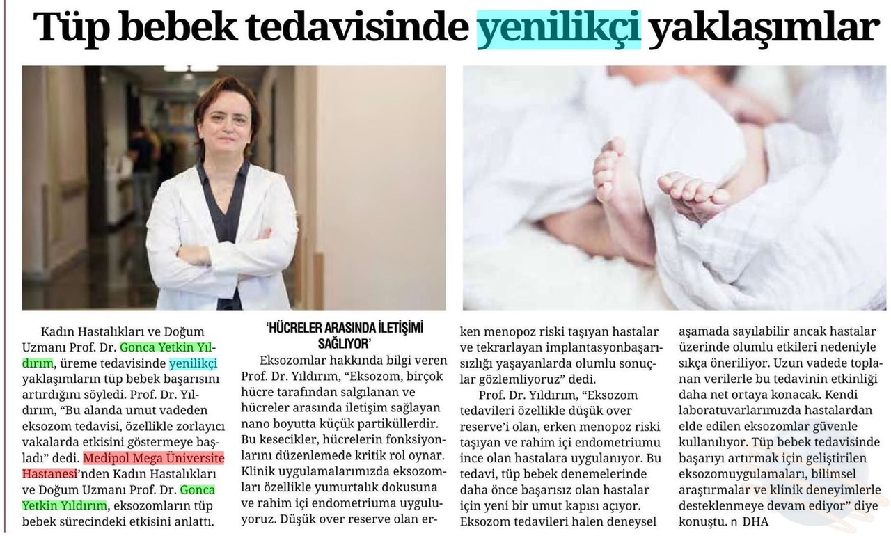 Prof. Dr. Yıldırım’ın aktardığına göre, eksozom tedavileri özellikle düşük over reserve’i olan, erken menopoz riski taşıyan ve rahim içi endometriumu ince olan hastalara uygulanıyor. Bu tedavi, tüp bebek denemelerinde daha önce başarısız olan hastalar için yeni bir umut kapısı açıyor. “Eksozom tedavileri halen deneysel aşamada sayılabilir ancak hastalar üzerinde olumlu etkileri nedeniyle sıkça öneriliyor. Uzun vadede toplanan verilerle bu tedavinin etkinliği daha net ortaya konacak,” diyen Prof. Dr. Yıldırım, kendi laboratuvarlarında hastalardan elde edilen eksozomların güvenle kullanıldığını belirtti. Prof. Dr. Yıldırım, “Tüp bebek tedavisinde başarıyı artırmak için geliştirilen eksozom uygulamaları, bilimsel araştırmalar ve klinik deneyimlerle desteklenmeye devam ediyor” diyerek sözlerini tamamladı.