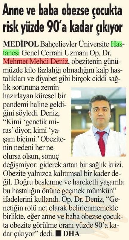 Obezitenin genetik yönünün göz ardı edilmemesi gerektiğini vurgulayan Op. Dr. Deniz, “Genetiğin rolü net olarak belirlenmemekle birlikte, eğer anne ve baba obezse çocukta obezite görülme oranı yüzde 90’a kadar çıkıyor. Ayrıca bazı etnik gruplarda obezite sıklığının daha fazla olması, genetik yatkınlığın da önemli bir faktör olduğunu gösteriyor” dedi.