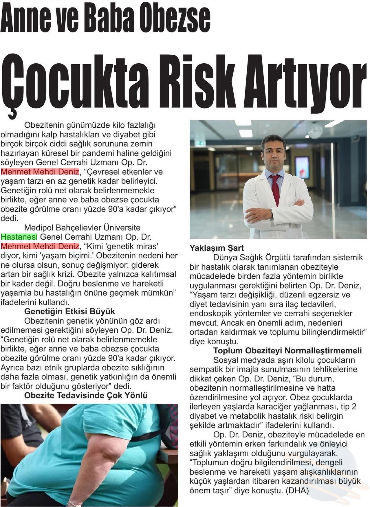 Sosyal medyada aşırı kilolu çocukların sempatik bir imajla sunulmasının tehlikelerine dikkat çeken Op. Dr. Deniz, “Bu durum, obezitenin normalleştirilmesine ve hatta özendirilmesine yol açıyor. Obez çocuklarda ilerleyen yaşlarda karaciğer yağlanması, tip 2 diyabet ve metabolik hastalık riski belirgin şekilde artmaktadır” ifadelerini kullandı. Op. Dr. Deniz, obeziteyle mücadelede en etkili yöntemin erken farkındalık ve önleyici sağlık yaklaşımı olduğunu vurgulayarak, “Toplumun doğru bilgilendirilmesi, dengeli beslenme ve hareketli yaşam alışkanlıklarının küçük yaşlardan itibaren kazandırılması büyük önem taşır” şeklinde konuştu.