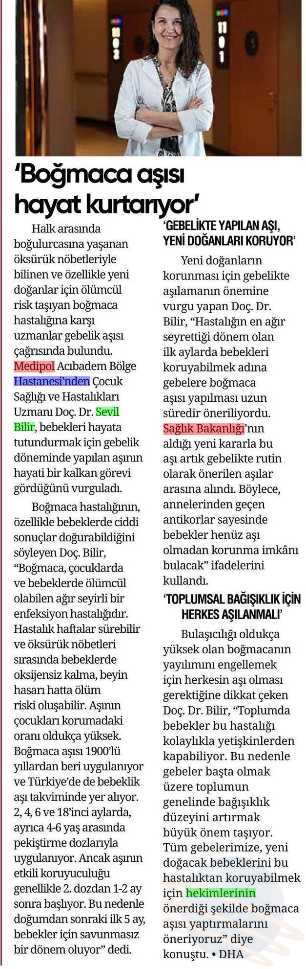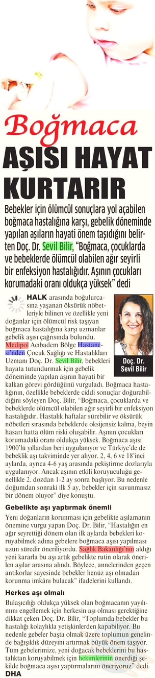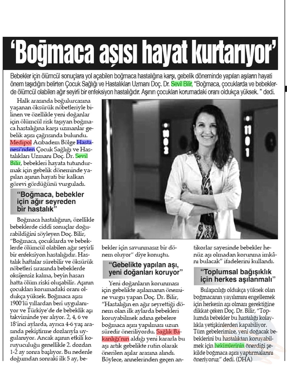 Özellikle bebekler için ölümcül sonuçlara yol açabilen boğmaca hastalığına karşı, gebelik döneminde yapılan aşılar hayati önem taşıyor. Medipol Sağlık Grubu’ndan Doç. Dr. Sevil Bilir, “Bebeklerin en savunmasız olduğu dönemde, anneden geçen bağışıklık sayesinde ciddi bir koruma sağlıyoruz” dedi.