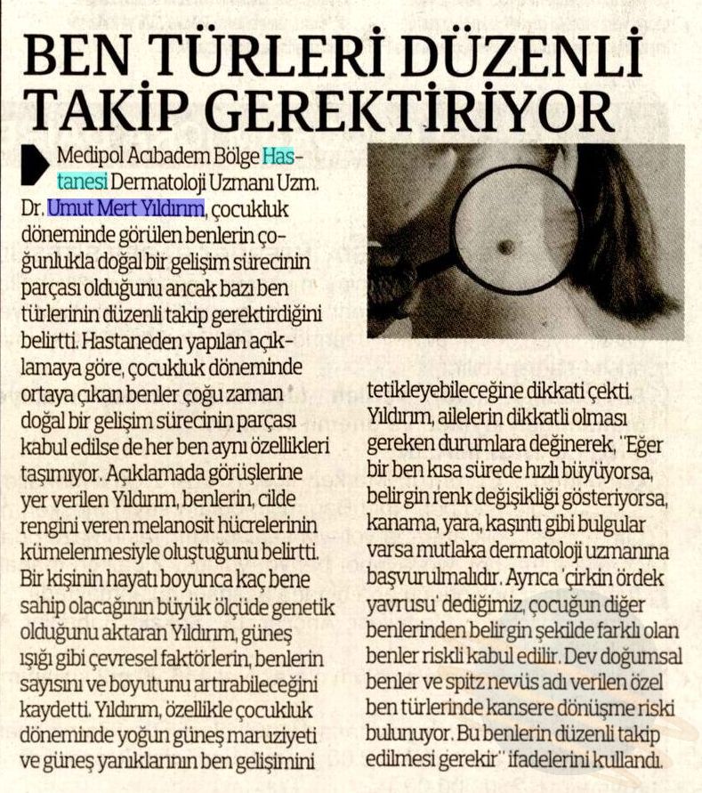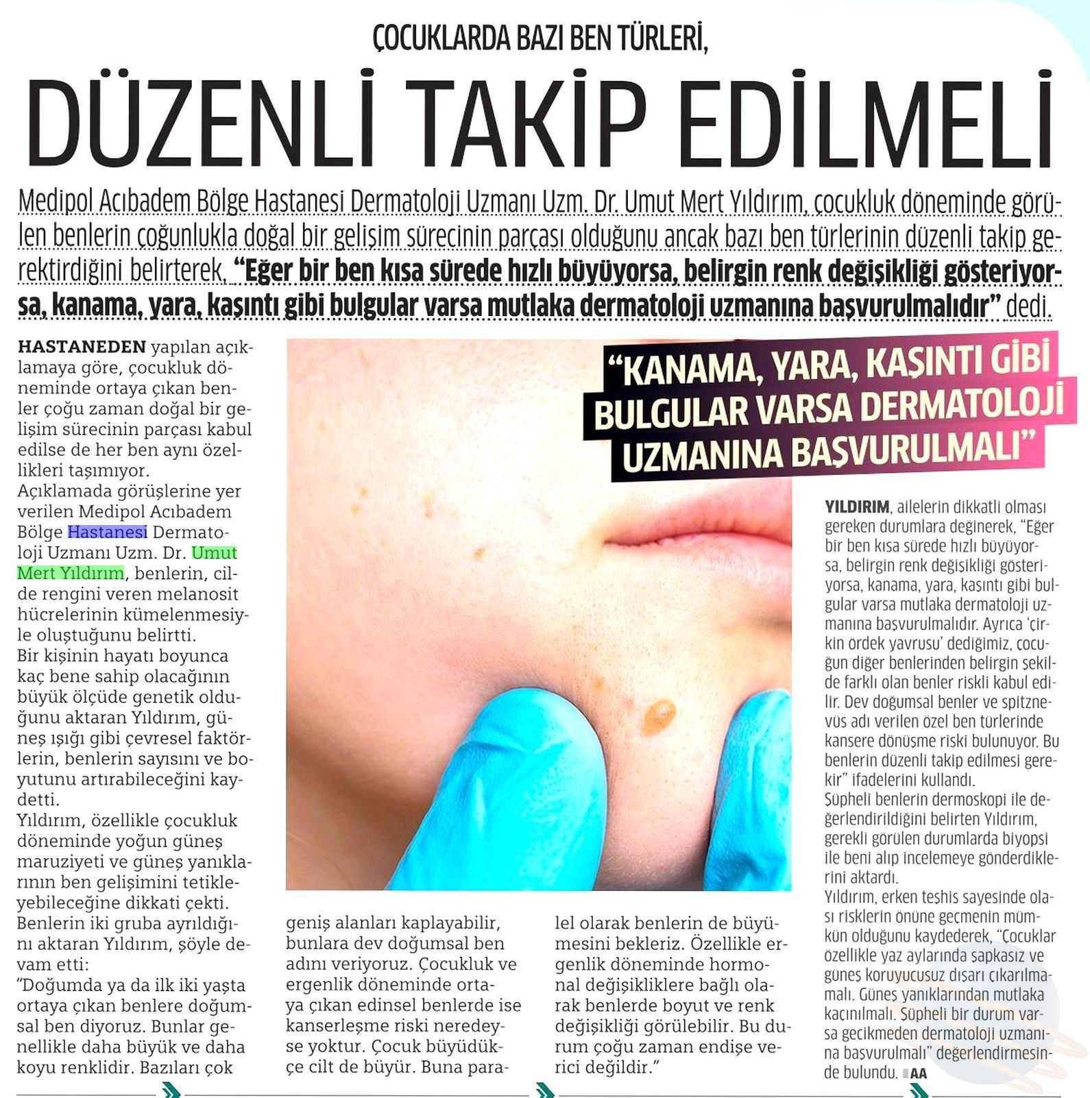 Ailelerin dikkatli olması gereken durumları sıralayan Dr. Yıldırım, “Eğer bir ben kısa sürede hızlı büyüyorsa, belirgin renk değişikliği gösteriyorsa, kanama, yara, kaşıntı gibi bulgular varsa mutlaka dermatoloji uzmanına başvurulmalıdır. Ayrıca ‘çirkin ördek yavrusu’ dediğimiz, çocuğun diğer benlerinden belirgin şekilde farklı olan benler riskli kabul edilir. Dev doğumsal benler ve spitz nevüs adı verilen özel ben türlerinde kansere dönüşme riskinin bulunuyor. Bu benlerin düzenli takip edilmesi gerekir” şeklinde konuştu.