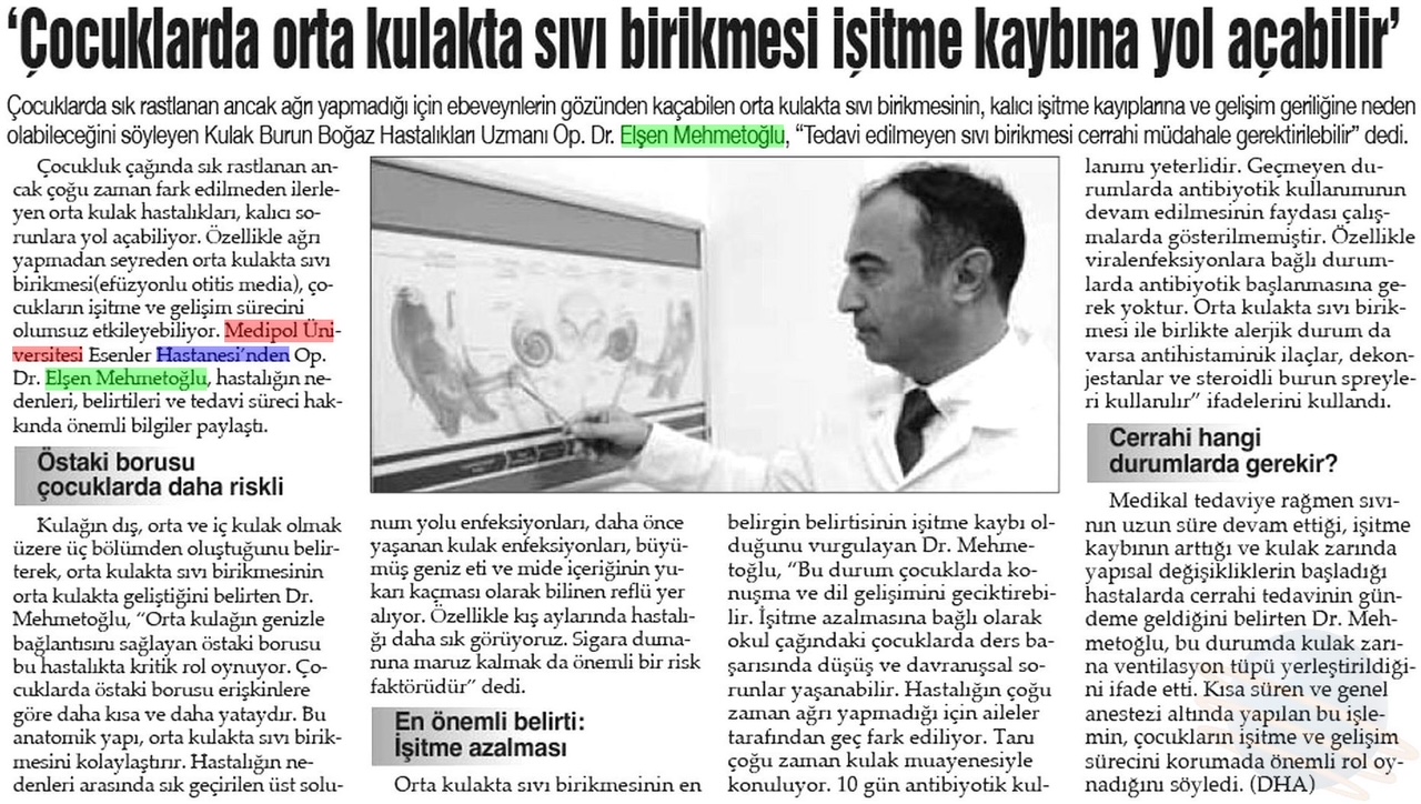 Çocuklarda sık rastlanan ancak ağrı yapmadığı için ebeveynlerin gözünden kaçabilen orta kulakta sıvı birikmesi, kalıcı işitme kayıplarına ve gelişim geriliğine davetiye çıkarıyor. Medipol Sağlık Grubu’ndan Kulak Burun Boğaz Hastalıkları Uzmanı Op. Dr. Elşen Mehmetoğlu, tedavi edilmeyen sıvı birikmesinin cerrahi müdahale gerektirebileceği konusunda uyardı.