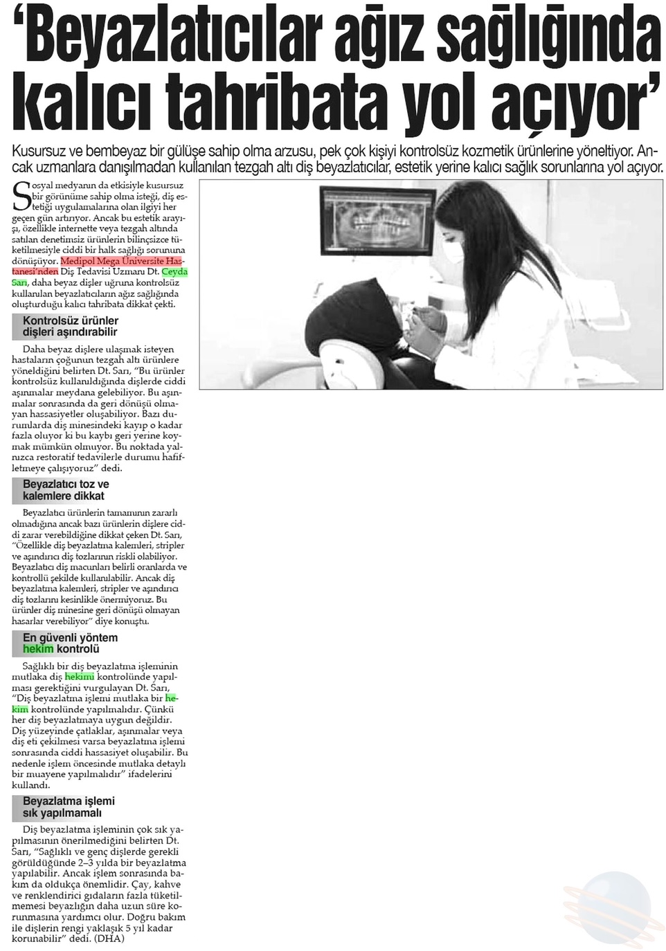 Sağlıklı bir diş beyazlatma işleminin mutlaka diş hekimi kontrolünde yapılması gerektiğini vurgulayan Dt. Sarı, “Diş beyazlatma işlemi mutlaka bir hekim kontrolünde yapılmalıdır. Çünkü her diş beyazlatmaya uygun değildir. Diş yüzeyinde çatlaklar, aşınmalar veya diş eti çekilmesi varsa beyazlatma işlemi sonrasında ciddi hassasiyet oluşabilir. Bu nedenle işlem öncesinde mutlaka detaylı bir muayene yapılmalıdır” ifadelerini kullandı.