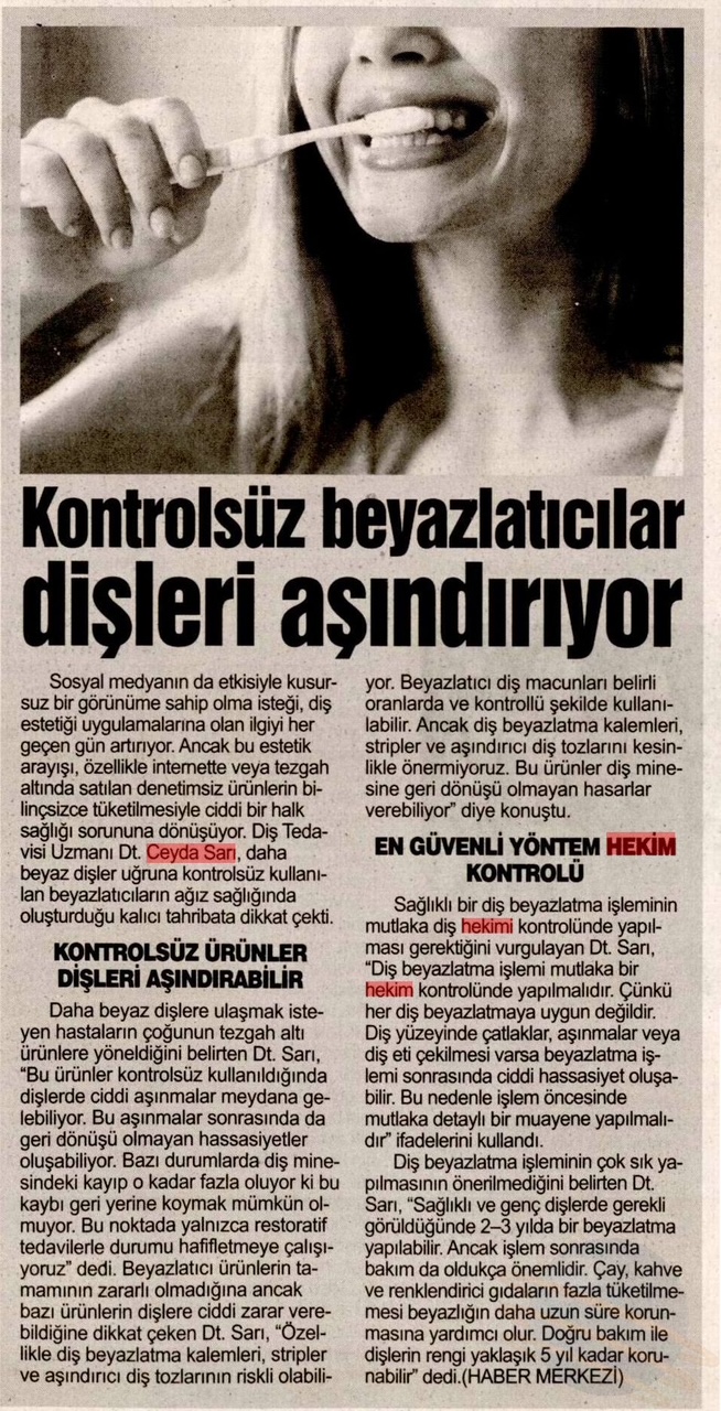Beyazlatıcı ürünlerin tamamının zararlı olmadığına ancak bazı ürünlerin dişlere ciddi zarar verebildiğine dikkat çeken Dt. Sarı, “Özellikle diş beyazlatma kalemleri, stripler ve aşındırıcı diş tozlarının riskli olabiliyor. Beyazlatıcı diş macunları belirli oranlarda ve kontrollü şekilde kullanılabilir. Ancak diş beyazlatma kalemleri, stripler ve aşındırıcı diş tozlarını kesinlikle önermiyoruz. Bu ürünler diş minesine geri dönüşü olmayan hasarlar verebiliyor” diye konuştu.