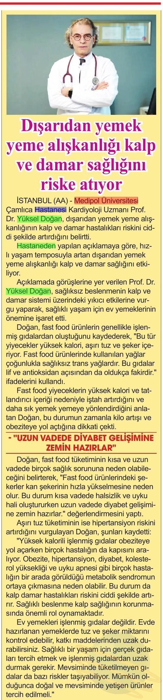 Hızlı yaşam temposuyla birlikte artan dışarıdan yemek yeme alışkanlığı, kalp ve damar sağlığını sessizce tüketiyor. Sağlıksız beslenmenin kalp ve damar sistemi üzerindeki yıkıcı etkilerine dikkat çeken Medipol Üniversitesi Çamlıca Hastanesi Kardiyoloji Uzmanı Prof. Dr. Yüksel Doğan, sağlıklı bir yaşam için mutfağa geri dönülmesi gerektiğini vurguladı.