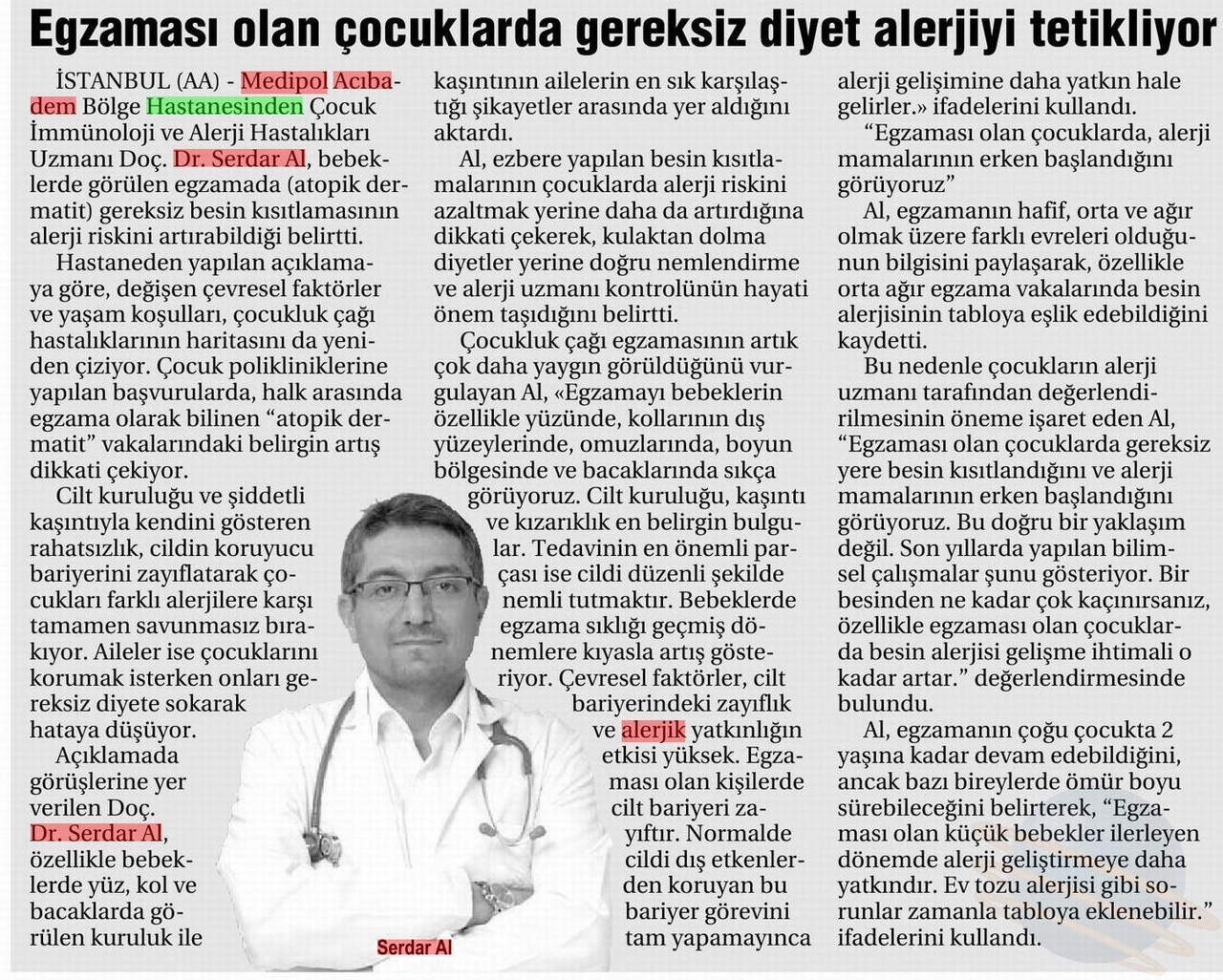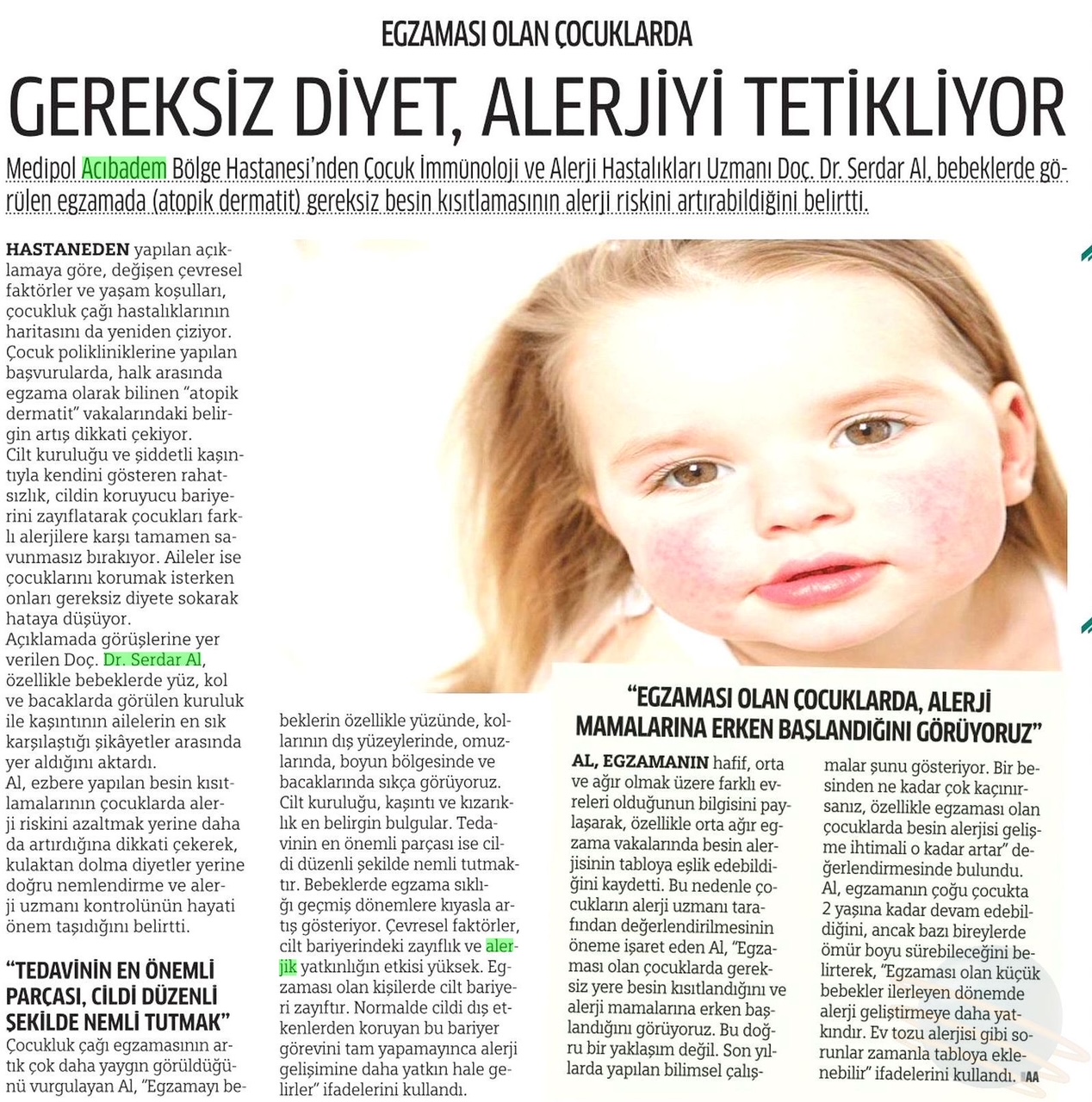 Günümüzde değişen çevresel faktörler ve yaşam koşulları, çocukluk çağı hastalıklarının haritasını da yeniden çiziyor. Hastanelerin çocuk polikliniklerine yapılan başvurularda, halk arasında egzama olarak bilinen atopik dermatit vakalarındaki belirgin artış dikkat çekiyor. Medipol Sağlık Grubu’ndan Çocuk İmmünoloji ve Alerji Hastalıkları Uzmanı Doç. Dr. Serdar Al, özellikle bebeklerde yüz, kol ve bacaklarda görülen kuruluk ile kaşıntının ailelerin en sık karşılaştığı şikâyetler arasında yer aldığını söyledi.