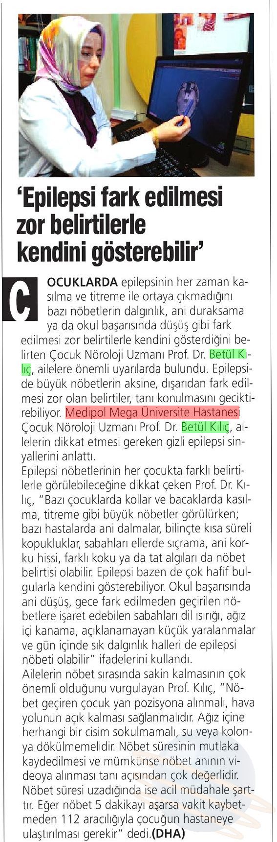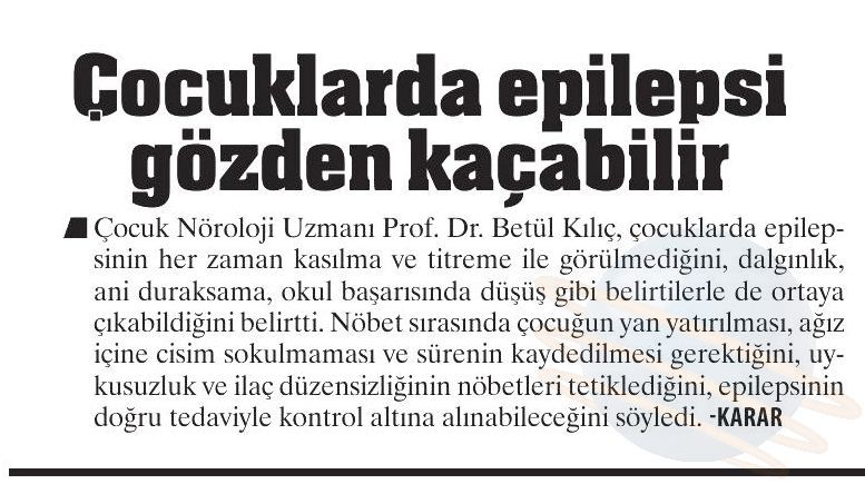 Epilepsi nöbetlerinin her çocukta farklı belirtilerle görülebileceğine dikkat çeken Prof. Dr. Kılıç, “Bazı çocuklarda kollar ve bacaklarda kasılma, titreme gibi büyük nöbetler görülürken; bazı hastalarda ani dalmalar, bilinçte kısa süreli kopukluklar, sabahları ellerde sıçrama, ani korku hissi, farklı koku ya da tat algıları da nöbet belirtisi olabilir. Epilepsi bazen de çok hafif bulgularla kendini gösterebiliyor. Okul başarısında ani düşüş, gece fark edilmeden geçirilen nöbetlere işaret edebilen sabahları dil ısırığı, ağız içi kanama, açıklanamayan küçük yaralanmalar ve gün içinde sık dalgınlık halleri de epilepsi nöbeti olabilir” ifadelerini kullandı.
