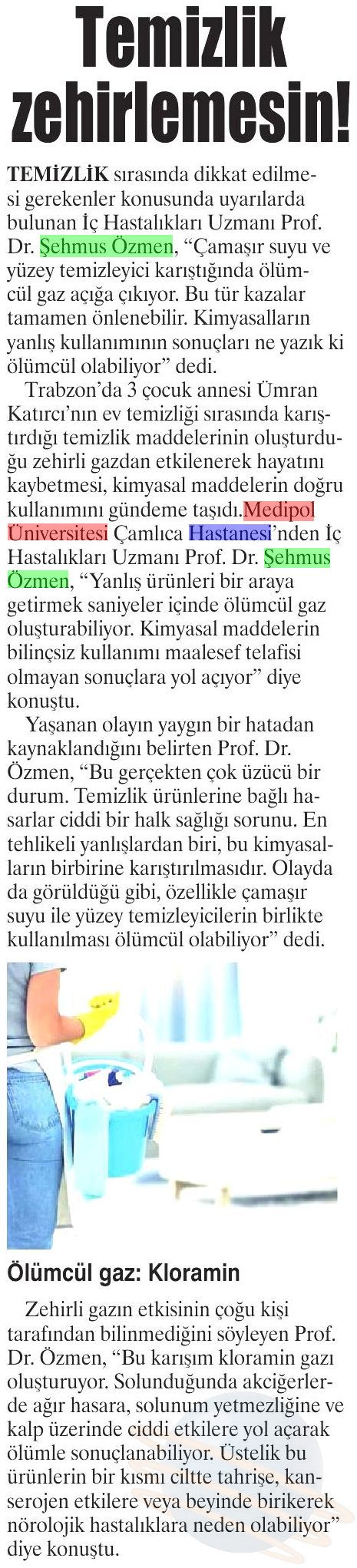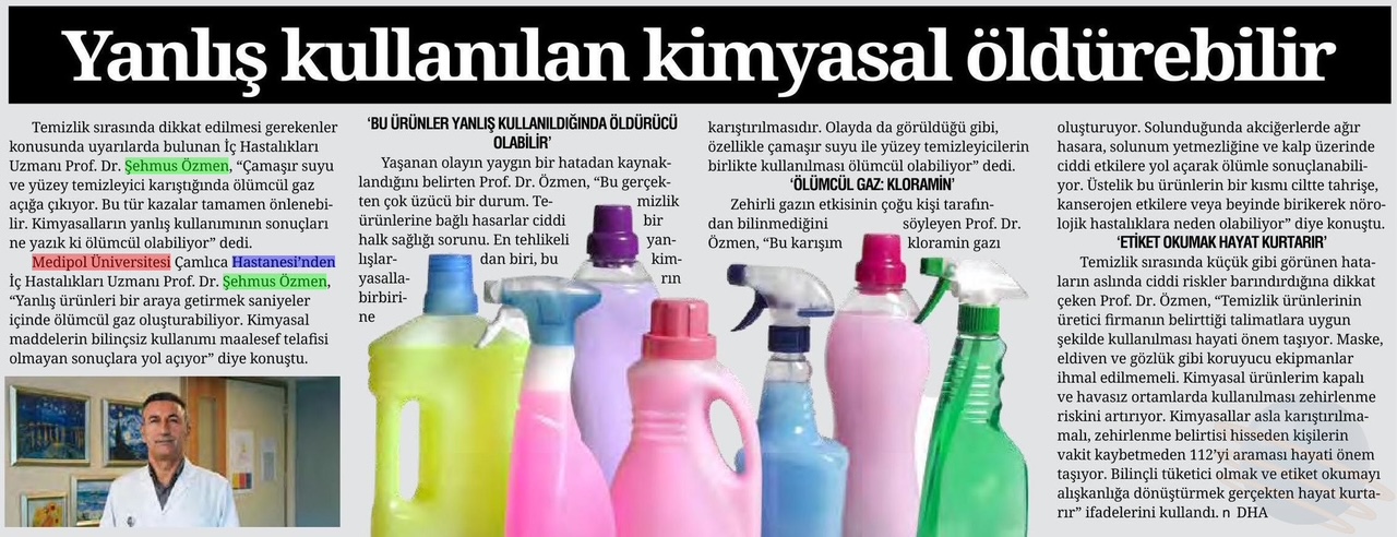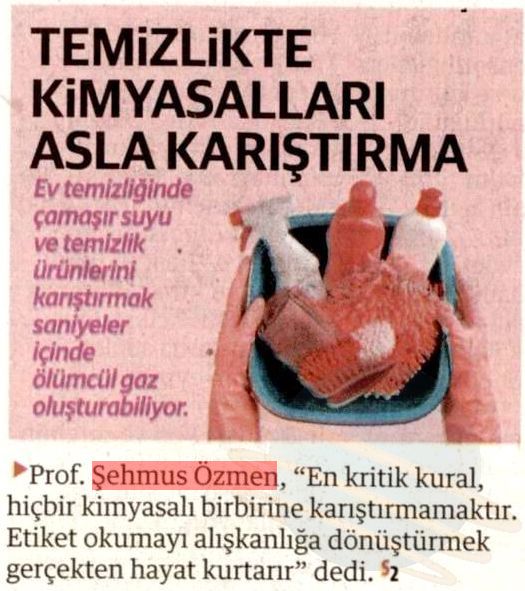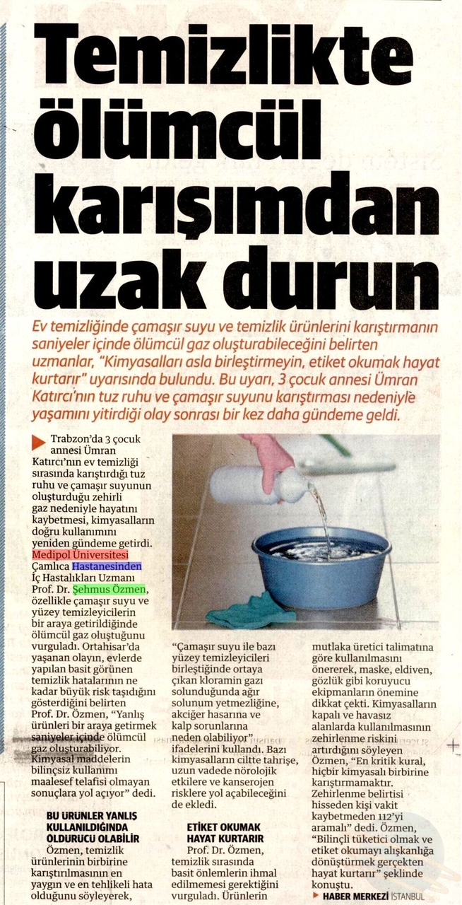 Yaşanan olayın yaygın bir hatadan kaynaklandığını belirten Prof. Dr. Özmen, “Bu gerçekten çok üzücü bir durum. Temizlik ürünlerine bağlı hasarlar ciddi bir halk sağlığı sorunu. En tehlikeli yanlışlardan biri, bu kimyasalların birbirine karıştırılmasıdır. Olayda da görüldüğü gibi, özellikle çamaşır suyu ile yüzey temizleyicilerin birlikte kullanılması ölümcül olabiliyor” dedi.