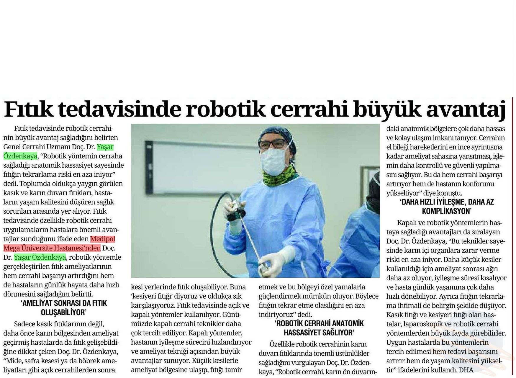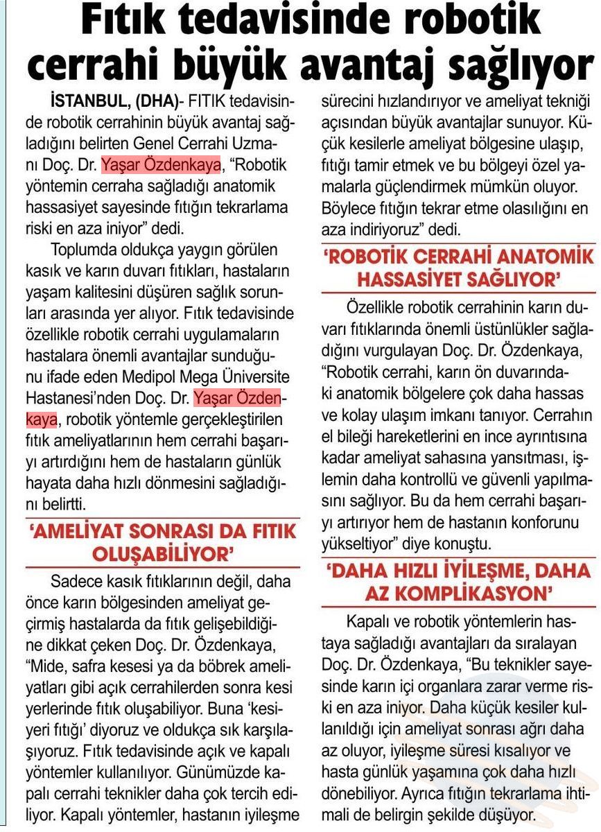 Özellikle robotik cerrahinin karın duvarı fıtıklarında önemli üstünlükler sağladığını vurgulayan Doç. Dr. Özdenkaya, “Robotik cerrahi, karın ön duvarındaki anatomik bölgelere çok daha hassas ve kolay ulaşım imkânı tanıyor. Cerrahın el bileği hareketlerini en ince ayrıntısına kadar ameliyat sahasına yansıtması, işlemin daha kontrollü ve güvenli yapılmasını sağlıyor. Bu da hem cerrahi başarıyı artırıyor hem de hastanın konforunu yükseltiyor” şeklinde konuştu.