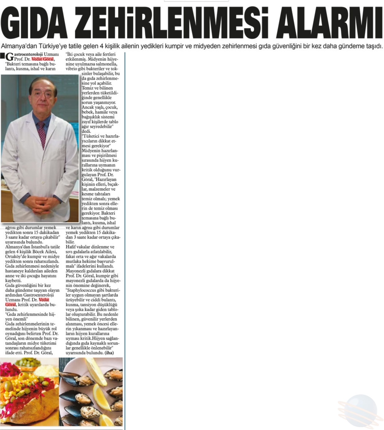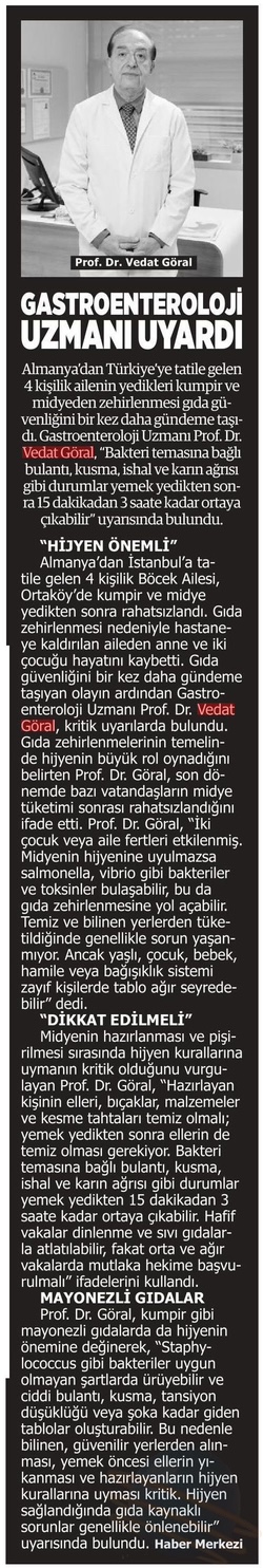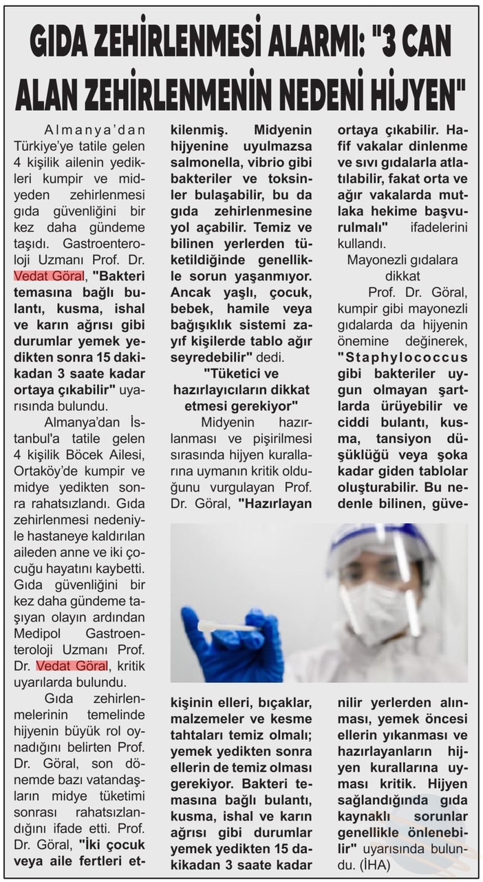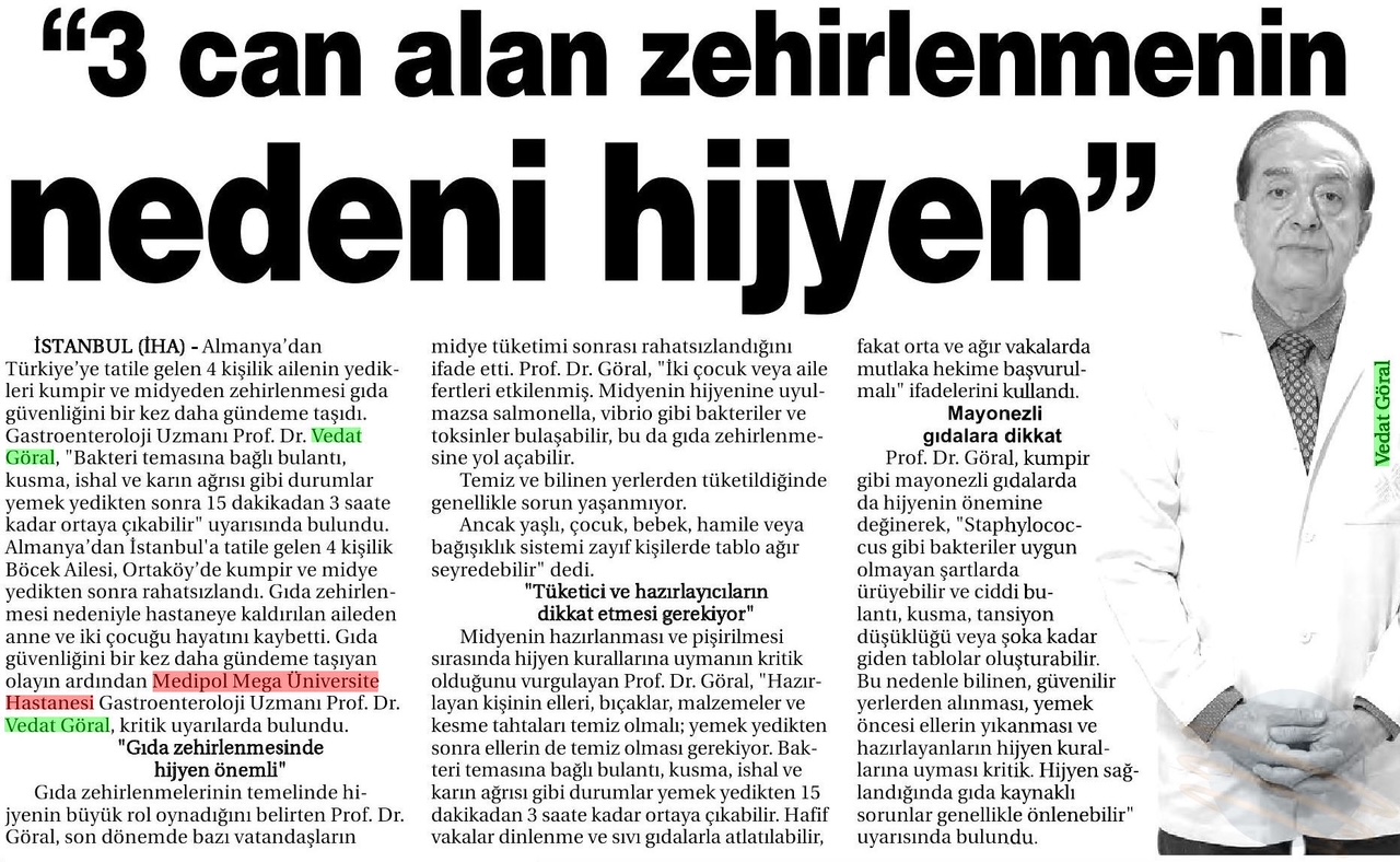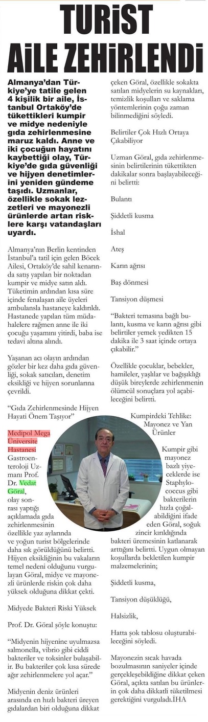 Almanya’dan Türkiye’ye tatile gelen 4 kişilik Böcek Ailesi, Ortaköy’de yedikleri kumpir ve midyeden zehirlendi. Anne ve iki çocuğu hayatını kaybetti. Olay, gıda güvenliğini bir kez daha gündeme taşırken, Medipol Sağlık Grubu’ndan Gastroenteroloji Uzmanı Prof. Dr. Vedat Göral, “Bakteri temasına bağlı bulantı, kusma, ishal ve karın ağrısı gibi durumlar yemek yedikten 15 dakikadan 3 saate kadar ortaya çıkabilir” uyarısında bulundu.