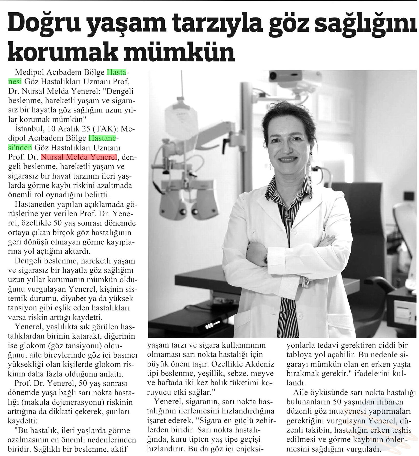 Görme kaybı bir anda olmuyor, yıllar içinde sessizce kapıyı çalıyor. Medipol Acıbadem Bölge Hastanesi’nden Göz Hastalıkları Uzmanı Prof. Dr. Nursal Melda Yenerel, özellikle 50 yaş sonrası dönemde ortaya çıkan birçok göz hastalığının geri dönüşü zor görme kayıplarına yol açtığını belirterek, “Dengeli beslenme, hareketli yaşam ve sigarasız bir hayatla göz sağlığını uzun yıllar korumak mümkün” diye konuştu.