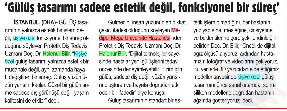 Gülüş tasarımının yalnızca estetik bir işlem değil, kişiye özel fonksiyonel bir süreç olduğunu vurgulayan Medipol Sağlık Grubu’ndan Protetik Diş Tedavisi Uzmanı Doç. Dr. Halenur Bilir, Dünya Gülümseme Günü nedeniyle yaptığı açıklamada, dijital teknolojiler sayesinde hastaların yeni gülüşlerini tedavi öncesinde deneyimleyebildiğini söyledi. Doç. Dr. Bilir, “Bizim için gülüş, sadece diş değil; yüzün yarısını oluşturan ve hayata doğrudan etki eden bir ifadedir” dedi.