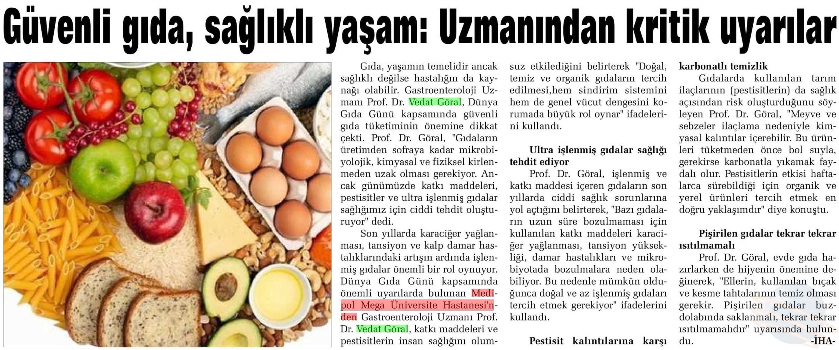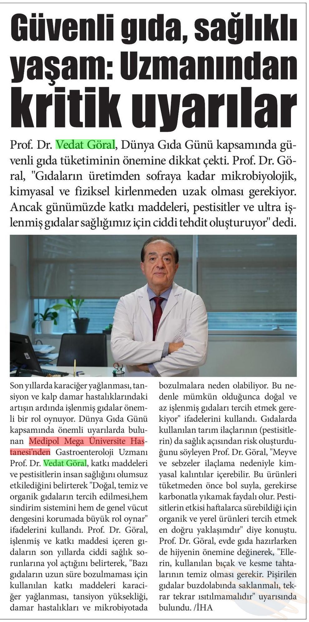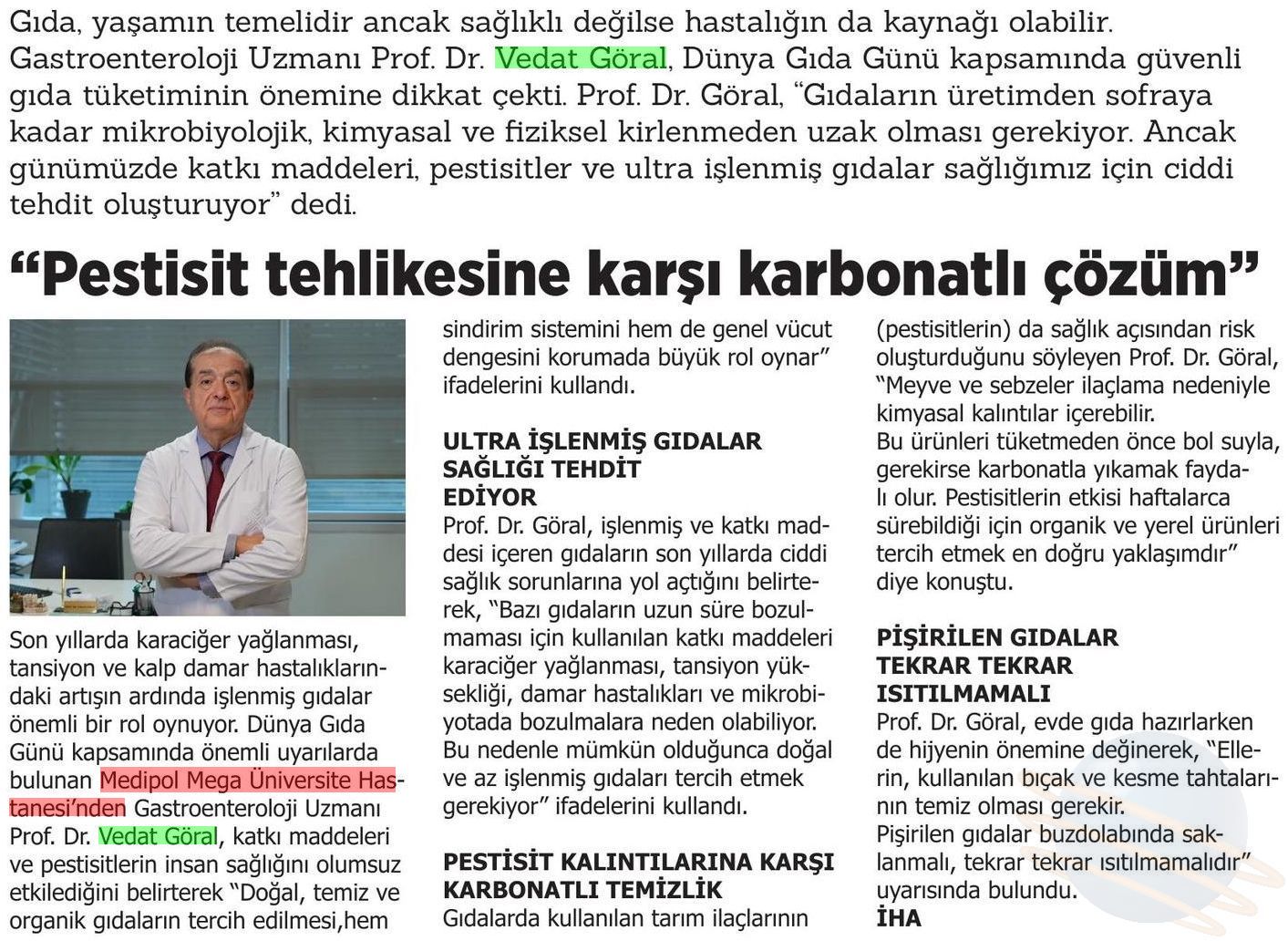Gıda, yaşamın temelidir ancak sağlıklı değilse hastalığın da kaynağı olabilir. Medipol Sağlık Grubu’ndan Gastroenteroloji Uzmanı Prof. Dr. Vedat Göral, Dünya Gıda Günü kapsamında güvenli gıda tüketiminin önemine dikkat çekti. Prof. Dr. Göral, “Gıdaların üretimden sofraya kadar mikrobiyolojik, kimyasal ve fiziksel kirlenmeden uzak olması gerekiyor. Ancak günümüzde katkı maddeleri, pestisitler ve ultra işlenmiş gıdalar sağlığımız için ciddi tehdit oluşturuyor” dedi.