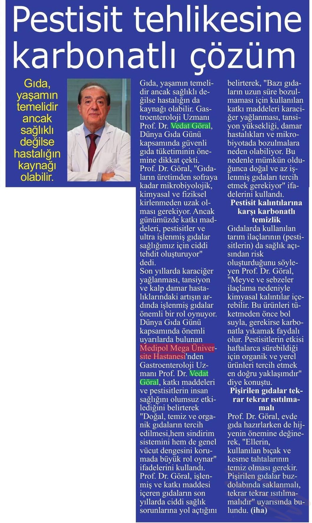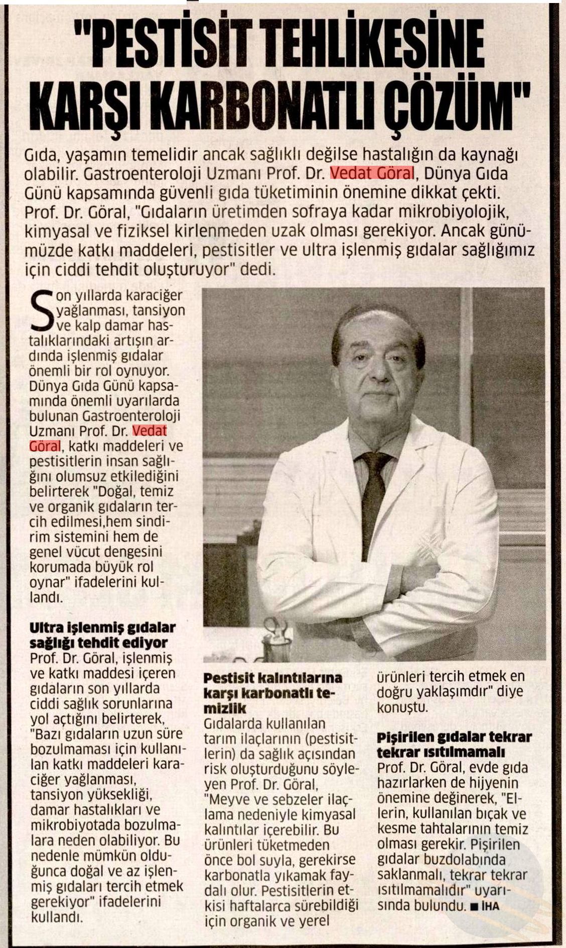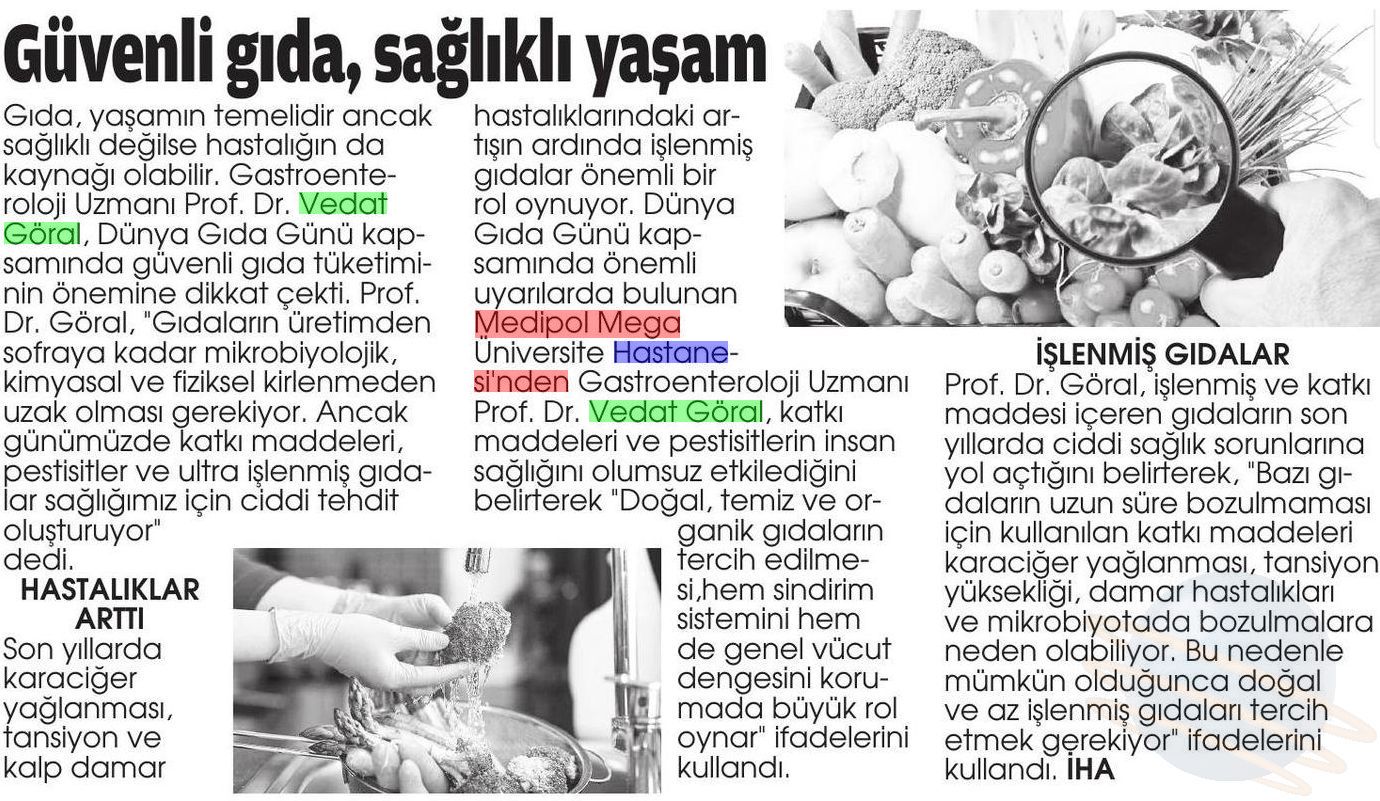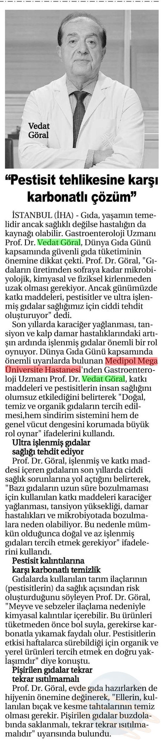 Gıda, yaşamın temelidir ancak sağlıklı değilse hastalığın da kaynağı olabilir. Medipol Sağlık Grubu’ndan Gastroenteroloji Uzmanı Prof. Dr. Vedat Göral, Dünya Gıda Günü kapsamında güvenli gıda tüketiminin önemine dikkat çekti. Prof. Dr. Göral, “Gıdaların üretimden sofraya kadar mikrobiyolojik, kimyasal ve fiziksel kirlenmeden uzak olması gerekiyor. Ancak günümüzde katkı maddeleri, pestisitler ve ultra işlenmiş gıdalar sağlığımız için ciddi tehdit oluşturuyor” dedi.