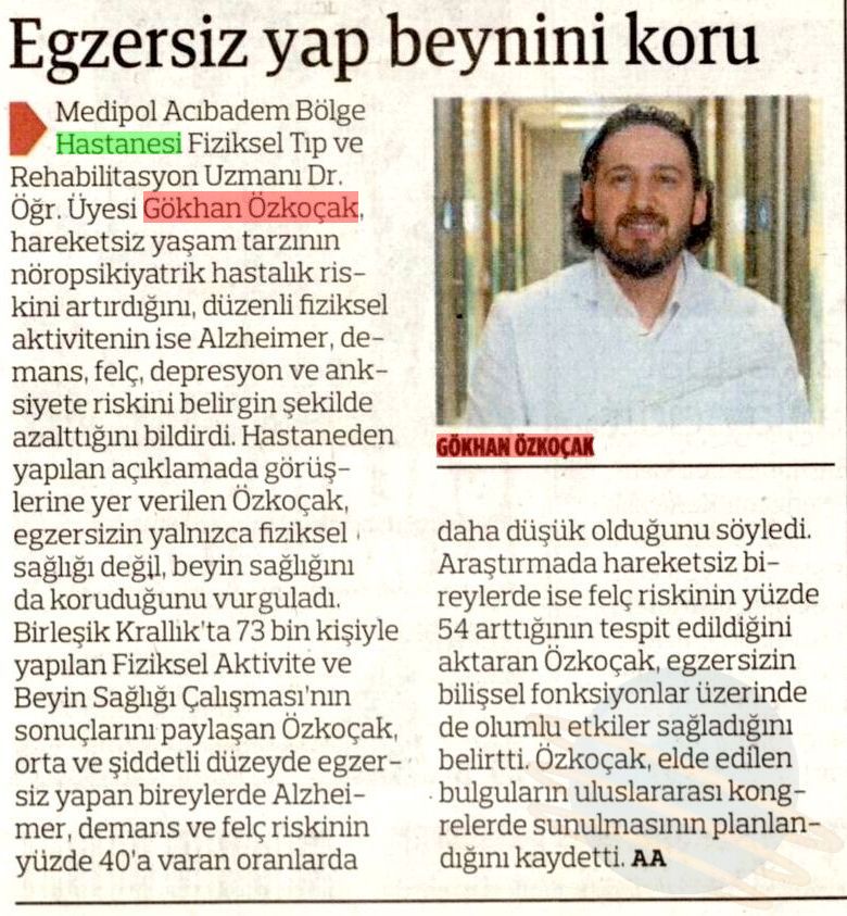 Daha önceki çalışmalarda egzersizin nöropsikiyatrik hastalıklara karşı koruyucu etkisinin bilindiğini hatırlatan Dr. Özkoçak, “Egzersizin sadece fiziksel sağlığa değil, bilişsel fonksiyonlara da olumlu katkı sağladığını gördük. Yapılan incelemelerde egzersiz yapan bireylerde Alzheimer Hastalığı’na yol açan proteinlerin daha az bulunduğu tespit edilmişti. Bu çalışma da ortaya çıkan sonucu destekler nitelikte. 73 bin kişinin verisinin analiz edildiği araştırmanın uluslararası kongrelerde sunulması bekleniyor” şeklinde konuştu.
