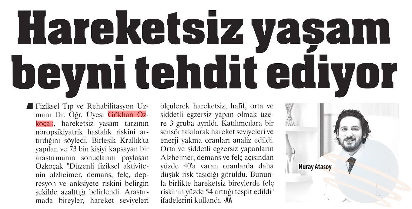 Araştırmada bireylerin hareket seviyeleri ölçülerek hareketsiz, hafif, orta ve şiddetli egzersiz yapan olmak üzere 3 gruba ayrıldığını ifade eden Dr. Öğr. Üyesi Gökhan Özkoçak, “Katılımcılara bir sensör takılarak hareket seviyeleri ve enerji yakma oranları analiz edildi. Çalışmanın sonuçlarına göre, orta ve şiddetli egzersiz yapan bireylerin alzheimer, demans ve felç açısından yüzde 40’a varan oranlarda daha düşük risk taşıdığı görüldü. Bununla birlikte hareketsiz bireylerde felç riskinin yüzde 54 oranında arttığı tespit edildi” dedi.