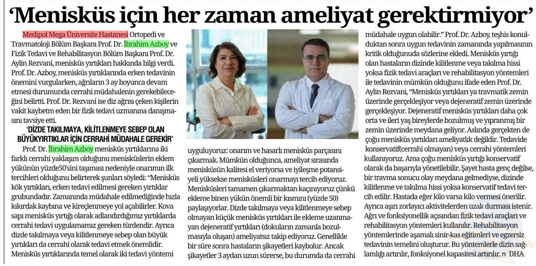 Dizde ani dönme, düşme veya darbeyle oluşan kök ve kova sapı gibi hayati menisküs yırtıkları, acil cerrahi müdahale gerektirebilir. Bu tür yırtıklar zamanında tedavi edilmezse kıkırdak kaybına ve kireçlenmeye yol açarak eklem sağlığını ciddi şekilde tehdit eder. Ancak, daha çok orta ve ileri yaşlarda, yıpranmış bir doku zemininde görülen dejeneratif menisküs yırtıkları, çoğunlukla ameliyatsız, fizik tedavi yöntemleriyle başarıyla tedavi edilebilir. Medipol Mega Üniversite Hastanesi Ortopedi ve Travmatoloji Bölüm Başkanı Prof. Dr. İbrahim Azboy ve Fizik Tedavi ve Rehabilitasyon Bölüm Başkanı Prof. Dr. Aylin Rezvani, konuyla ilgili uzmanlık alanlarından görüşlerini belirtti. Prof. Dr. Azboy, menisküs yırtıklarında erken tedavinin önemini vurgularken, ağrıların 3 ay boyunca devam etmesi durumunda cerrahi müdahalenin gerekebileceğini belirtti. Prof. Dr. Rezvani ise diz ağrısı çeken kişilerin vakit kaybetmeden bir fizik tedavi uzmanına danışmasını tavsiye etti.