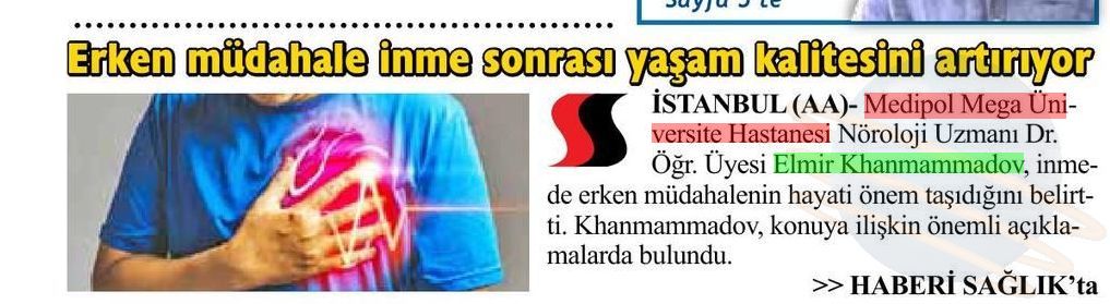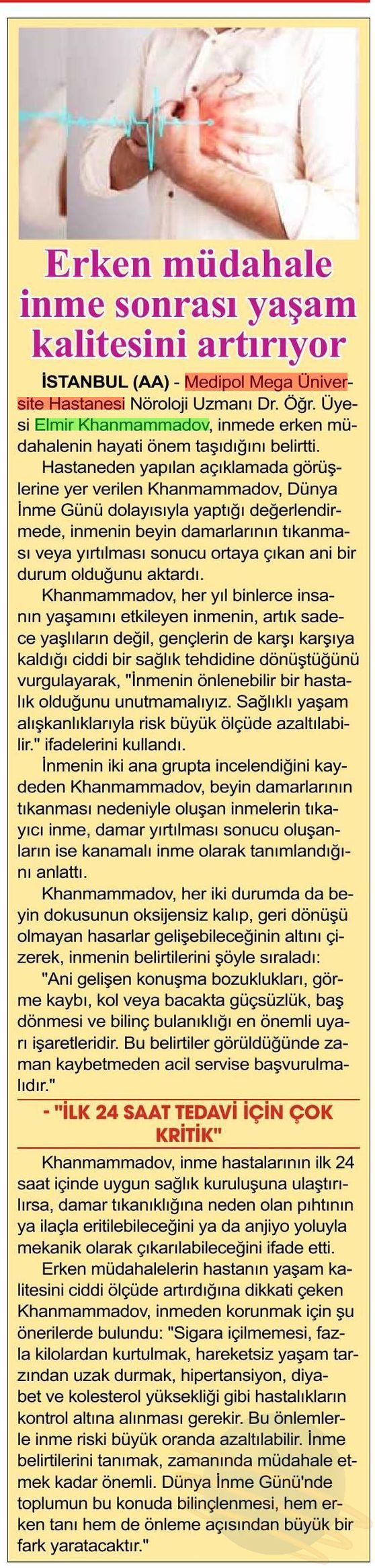 İnmenin belirtilerine değinen Dr. Khanmammadov, “Ani gelişen konuşma bozuklukları, görme kaybı, kol veya bacakta güçsüzlük, baş dönmesi ve bilinç bulanıklığı en önemli uyarı işaretleridir. Bu belirtiler görüldüğünde zaman kaybetmeden acil servise başvurulmalıdır” uyarısında bulundu.