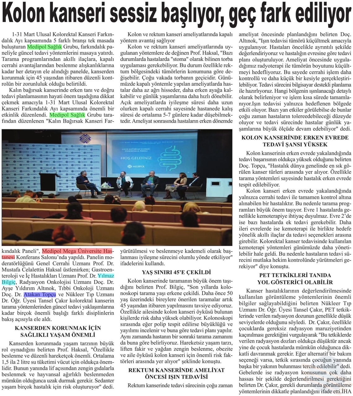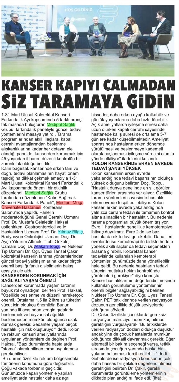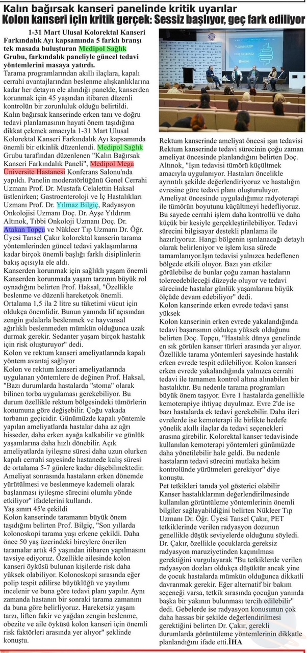 Kalın bağırsak kanserinde erken tanı ve doğru tedavi planlamasının hayati önem taşıdığına dikkat çekmek amacıyla 1–31 Mart Ulusal Kolorektal Kanseri Farkındalık Ayı kapsamında önemli bir etkinlik düzenlendi. Medipol Sağlık Grubu tarafından düzenlenen “Kalın Bağırsak Kanseri Farkındalık Paneli”, Medipol Mega Üniversite Hastanesi Konferans Salonu’nda yapıldı. Panelin moderatörlüğünü Genel Cerrahi Uzmanı Prof. Dr. Mustafa Celalettin Haksal üstlenirken; Gastroenteroloji ve İç Hastalıkları Uzmanı Prof. Dr. Yılmaz Bilgiç, Radyasyon Onkolojisi Uzmanı Doç. Dr. Ayşe Yıldırım Altınok, Tıbbi Onkoloji Uzmanı Doç. Dr. Atakan Topçu ve Nükleer Tıp Uzmanı Dr. Öğr. Üyesi Tansel Çakır kolorektal kanserin tarama yöntemlerinden güncel tedavi yaklaşımlarına kadar birçok önemli başlığı farklı disiplinlerin bakış açısıyla ele aldı.