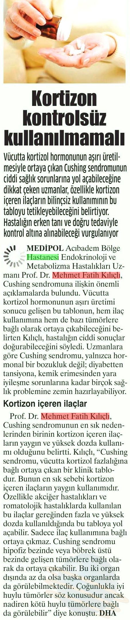Kontrolsüz kullanılan kortizon içeren ilaçlar, vücutta kortizol fazlalığına yol açarak Cushing sendromuna neden olabiliyor. Medipol Acıbadem Bölge Hastanesi’nden Prof. Dr. Mehmet Fatih Kılıçlı, Cushing sendromunun vücutta kortizol hormonunun aşırı üretimi sonucu ortaya çıkan önemli bir sağlık sorunu olduğunu söyledi. Kortizol fazlalığının en sık nedenlerinden birinin kortizon içeren ilaçların yaygın ve yüksek dozda kullanımı olduğunu belirten Kılıçlı, bunun dışında başta hipofiz bezinde veya böbrek üstü bezinde olmak üzere nadiren de farklı organlarda gelişen tümörlerin de hastalığa neden olabileceğini ifade etti.