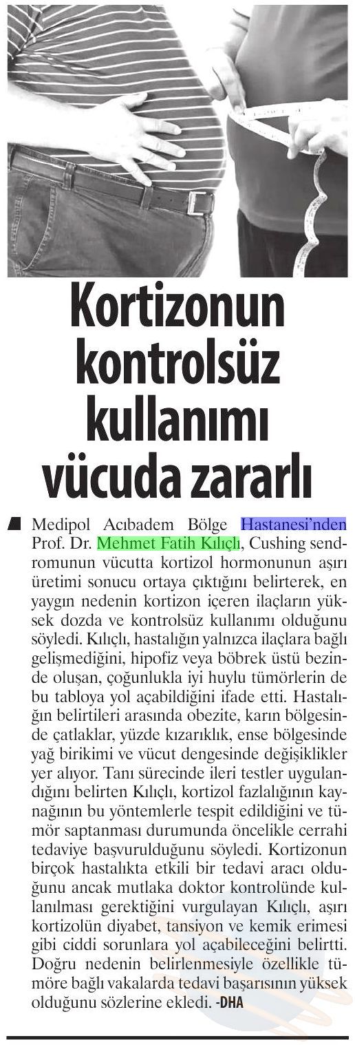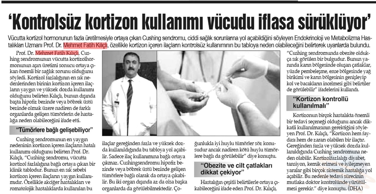 Kortizonun birçok hastalıkta önemli bir tedavi seçeneği olduğunu ancak dikkatli kullanılmasının gerektiğini vurgulayan Prof. Dr. Kılıçlı, “Kortizon hem faydası hem de zararı olabilen bir ilaçtır. Gereğinden fazla ve yüksek dozda kullanıldığında Cushing sendromuna neden olabilir. Kortizol fazlalığı diyabet, tansiyon, kemik erimesi ve iyileşmeyen yaralar gibi birçok sistemik hastalığa yol açabilir. Bu nedenle tedavi sürecinin mutlaka doktor kontrolünde yürütülmesi gerekir. Cushing sendromunun nedeninin doğru belirlenmesi tedavi açısından büyük önem taşıyor. Eğer tümöre bağlı bir durum varsa doğru odağı bulup cerrahi olarak ortadan kaldırdığımızda hastalığın tamamen düzelme şansı oldukça yüksektir” dedi.