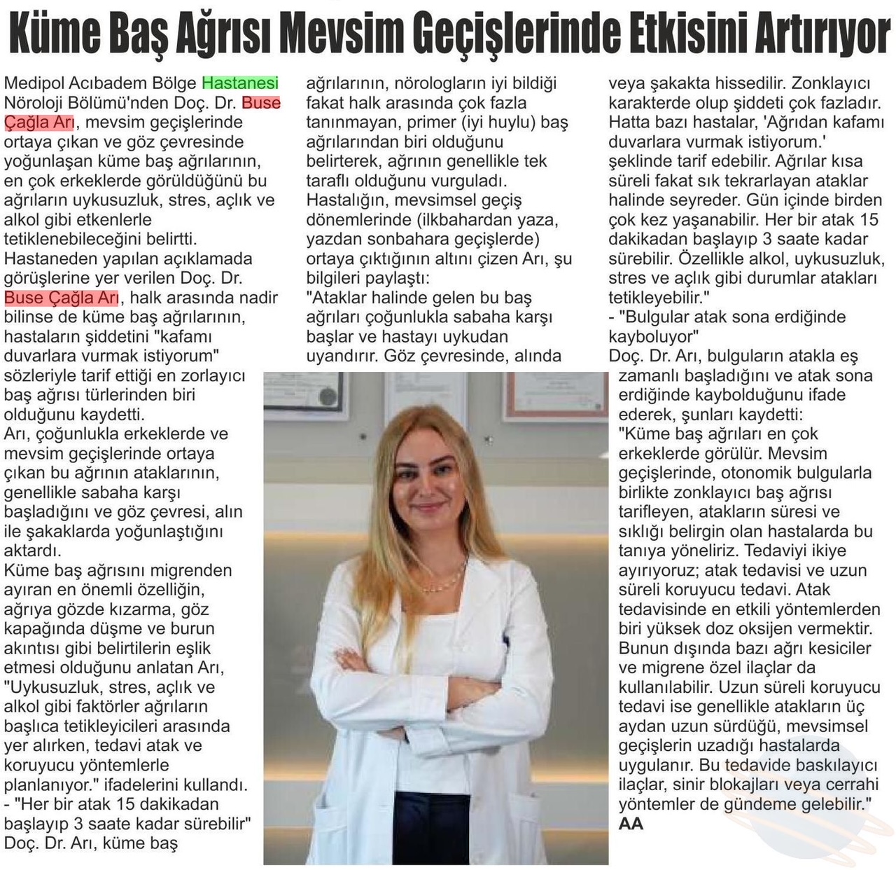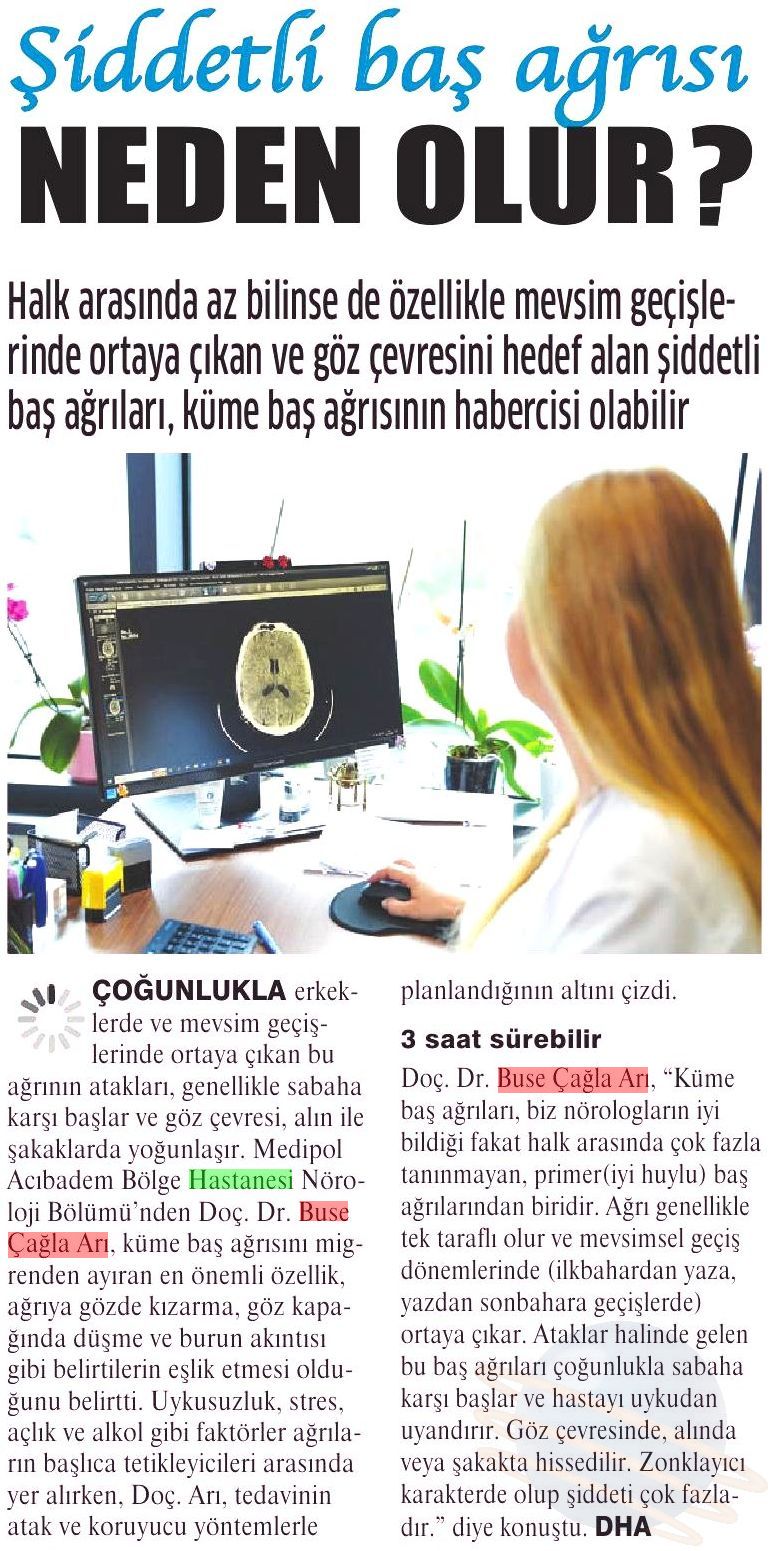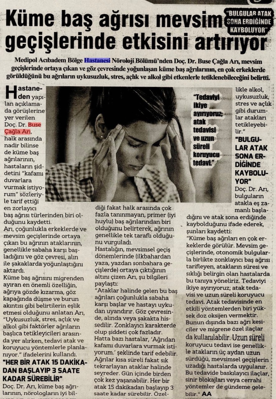 Doç. Dr. Buse Çağla Arı, “Küme baş ağrıları, biz nörologların iyi bildiği fakat halk arasında çok fazla tanınmayan, primer (iyi huylu) baş ağrılarından biridir. Ağrı genellikle tek taraflı olur ve mevsimsel geçiş dönemlerinde (ilkbahardan yaza, yazdan sonbahara geçişlerde) ortaya çıkar. Ataklar halinde gelen bu baş ağrıları çoğunlukla sabaha karşı başlar ve hastayı uykudan uyandırır. Göz çevresinde, alında veya şakakta hissedilir. Zonklayıcı karakterde olup şiddeti çok fazladır. Hatta bazı hastalar, ‘Ağrıdan kafamı duvarlara vurmak istiyorum.’ şeklinde tarif edebilir. Ağrılar kısa süreli fakat sık tekrarlayan ataklar halinde seyreder. Gün içinde birden çok kez yaşanabilir. Her bir atak 15 dakikadan başlayıp 3 saate kadar sürebilir. Özellikle alkol, uykusuzluk, stres ve açlık gibi durumlar atakları tetikleyebilir.” diye konuştu.