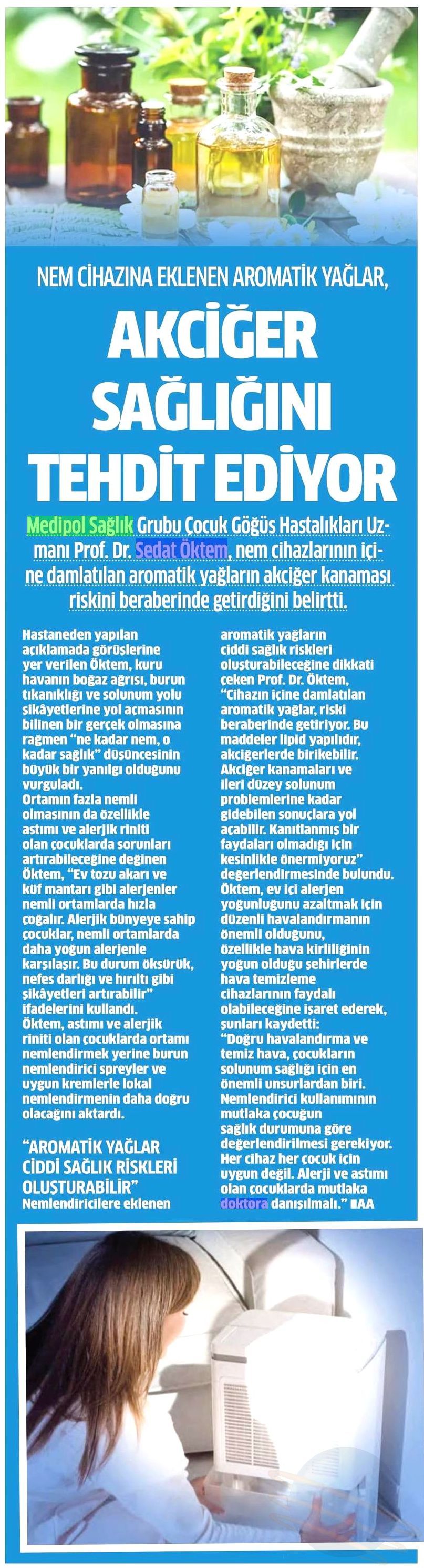 Nemlendiricilere eklenen aromatik yağların ciddi sağlık riskleri oluşturabileceğine dikkat çeken Prof. Dr. Öktem, “Bu maddeler lipid yapılıdır, akciğerlerde birikebilir. Akciğer kanamaları ve ileri düzey solunum problemlerine kadar gidebilen sonuçlara yol açabilir. Kanıtlanmış bir faydaları olmadığı için kesinlikle önermiyoruz” ifadelerini kullandı. Ev içi alerjen yoğunluğunu azaltmak için düzenli havalandırmanın önemine değinen Prof. Dr. Öktem, özellikle hava kirliliğinin yoğun olduğu şehirlerde hava temizleme cihazlarının faydalı olabileceğini belirtti. “Doğru havalandırma ve temiz hava, çocukların solunum sağlığı için en önemli unsurlardan biridir” dedi. Prof. Dr. Sedat Öktem, nemlendirici kullanımının mutlaka çocuğun sağlık durumuna göre değerlendirilmesi gerektiğini vurgulayarak, “Her cihaz her çocuk için uygun değildir. Alerji ve astımı olan çocuklarda mutlaka doktora danışılmalıdır” uyarısında bulundu.