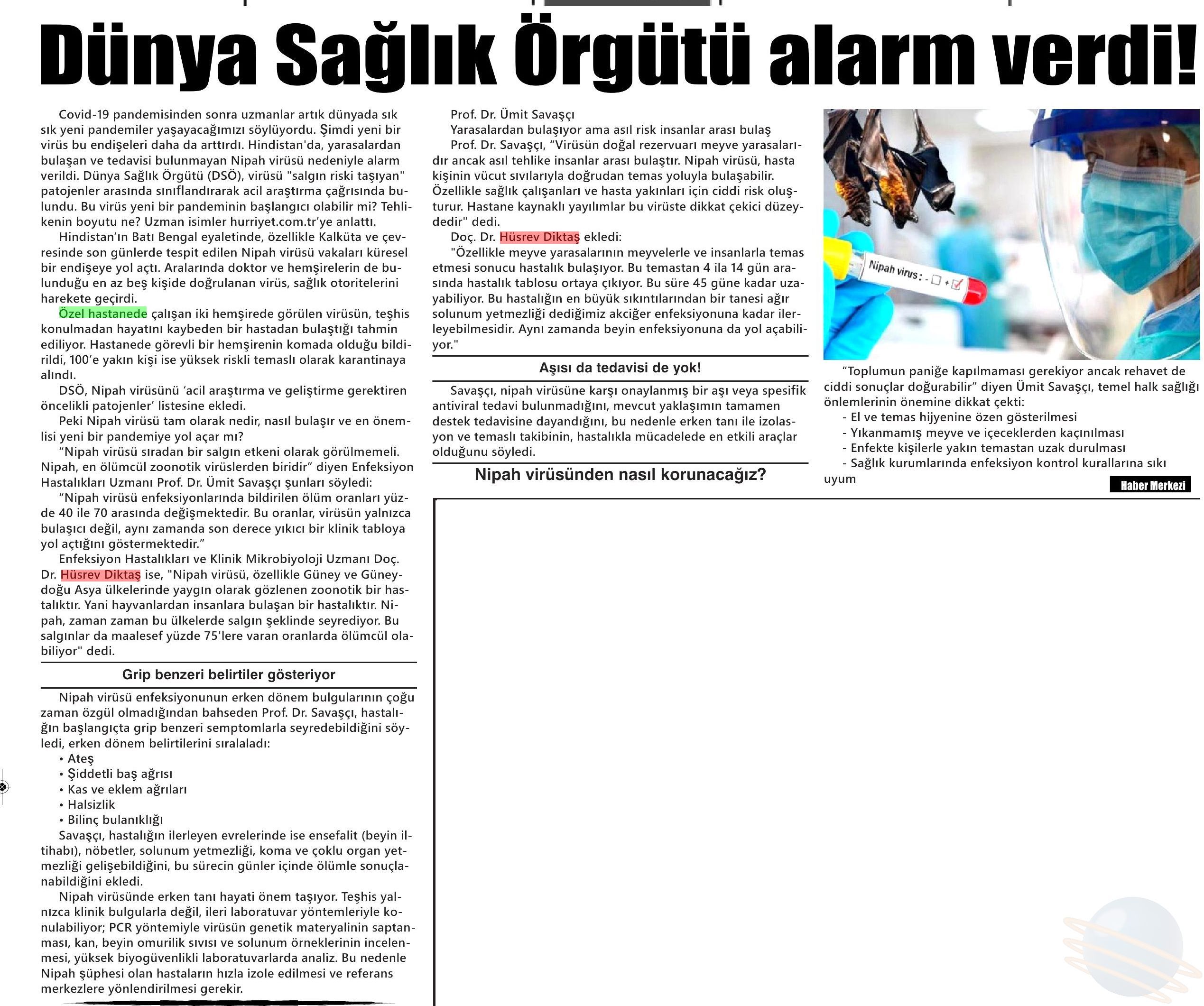 Hindistan’daki Nipah virüsü salgını, dünyayı yeniden maske ve mesafe günlerine döndürme endişesi oluşturdu. Ölüm oranının yüksek olduğu bu virüse karşı henüz bir ilaç veya aşı bulunmadığını vurgulayan Doç. Dr. Hüsrev Diktaş, “Hastalık grip gibi başlayıp beyin iltihabına dönüşebiliyor. Asya seyahatinden dönenler 45 gün boyunca kendini izlemeli” uyarısında bulundu.