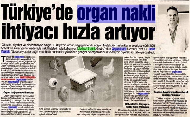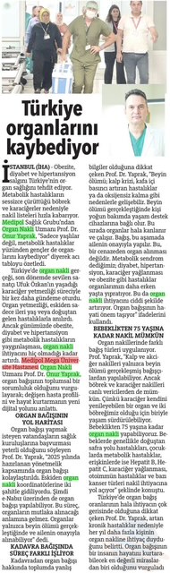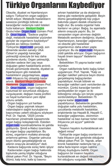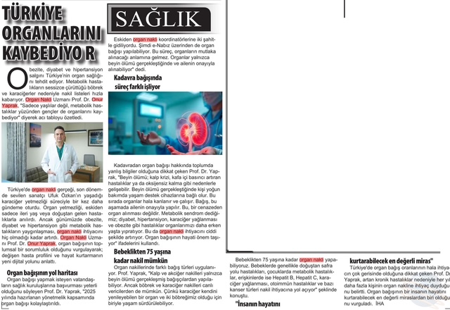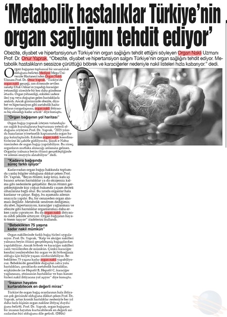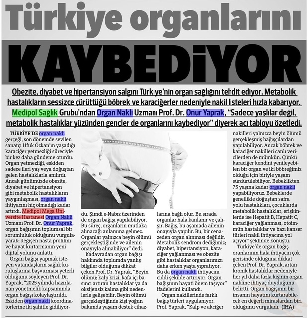 Obezite, diyabet ve hipertansiyon salgını Türkiye’nin organ sağlığını tehdit ediyor. Metabolik hastalıkların sessizce çürüttüğü böbrek ve karaciğerler nedeniyle nakil listeleri hızla kabarıyor. Medipol Sağlık Grubu’ndan Organ Nakli Uzmanı Prof. Dr. Onur Yaprak, “Sadece yaşlılar değil, metabolik hastalıklar yüzünden gençler de organlarını kaybediyor” diyerek acı tabloyu özetledi.