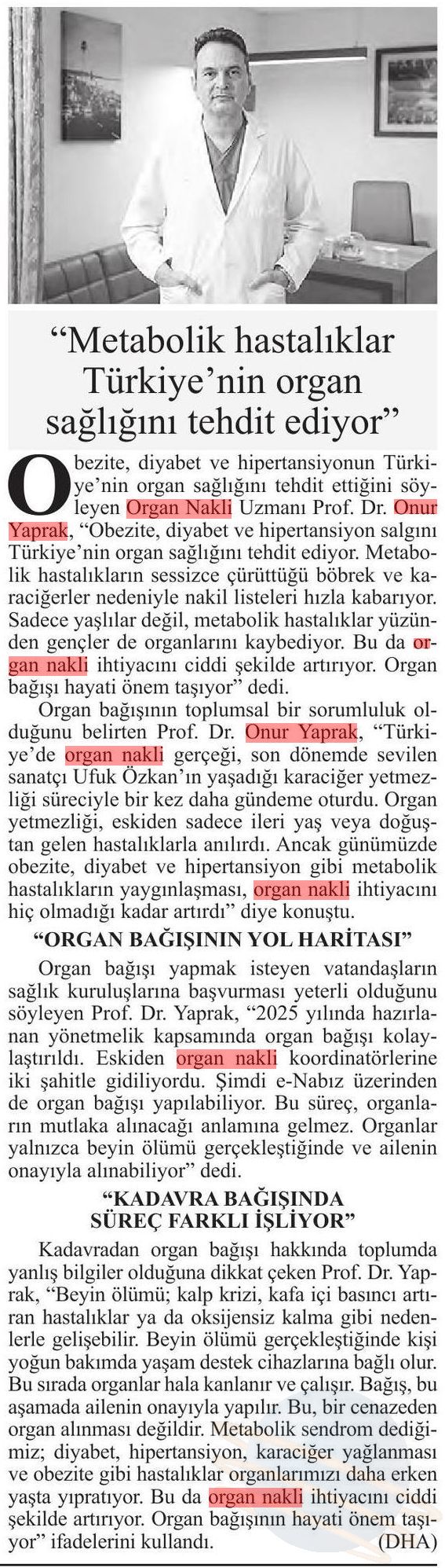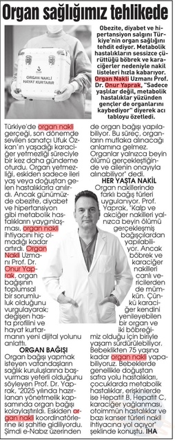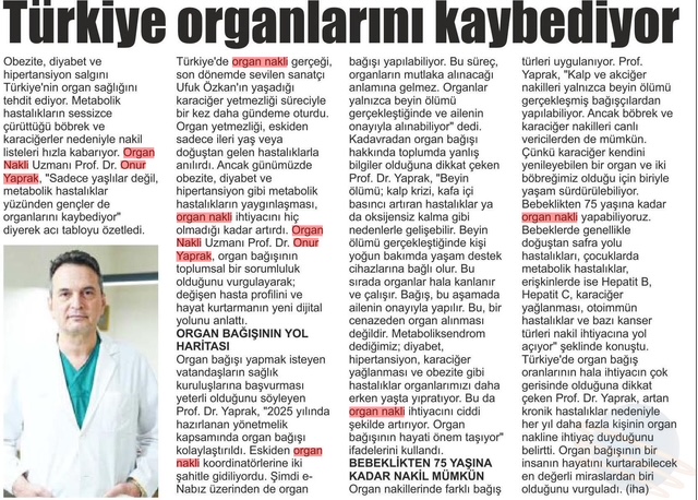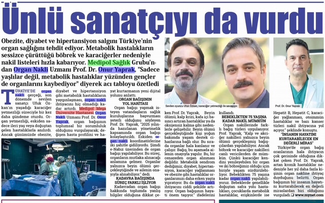 Türkiye’de organ nakli gerçeği, son dönemde sevilen sanatçı Ufuk Özkan’ın yaşadığı karaciğer yetmezliği süreciyle bir kez daha gündeme oturdu. Organ yetmezliği, eskiden sadece ileri yaş veya doğuştan gelen hastalıklarla anılırdı. Ancak günümüzde obezite, diyabet ve hipertansiyon gibi metabolik hastalıkların yaygınlaşması, organ nakli ihtiyacını hiç olmadığı kadar artırdı. Medipol Mega Üniversite Hastanesi Organ Nakli Uzmanı Prof. Dr. Onur Yaprak, organ bağışının toplumsal bir sorumluluk olduğunu vurgulayarak; değişen hasta profilini ve hayat kurtarmanın yeni dijital yolunu anlattı.