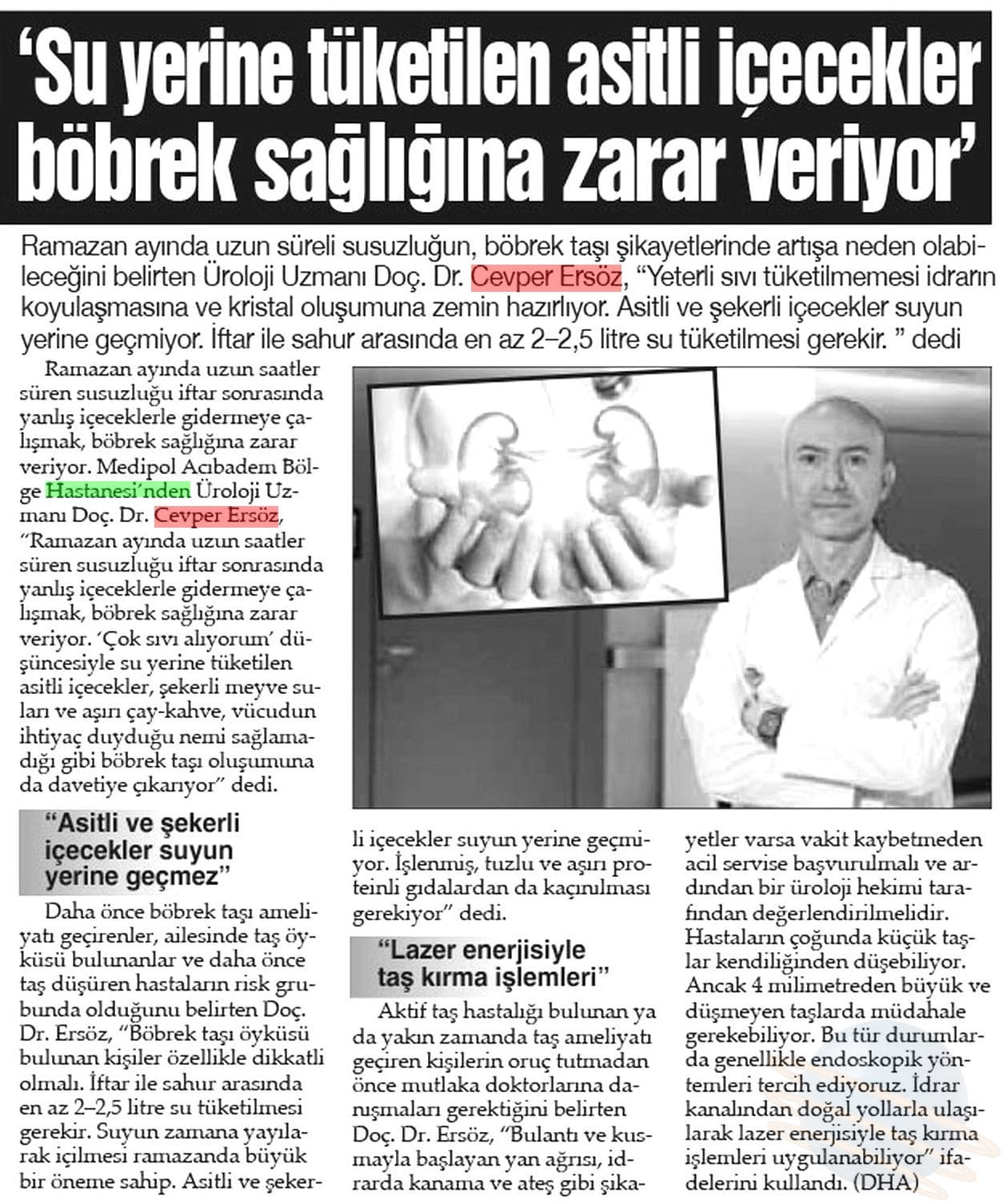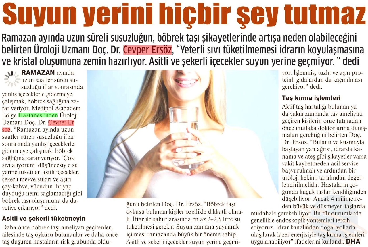 Daha önce böbrek taşı ameliyatı geçirenler, ailesinde taş öyküsü bulunanlar ve daha önce taş düşüren hastaların risk grubunda olduğunu belirten Doç. Ersöz, “Böbrek taşı öyküsü bulunan kişiler özellikle dikkatli olmalı. İftar ile sahur arasında en az 2–2,5 litre su tüketilmesi gerekir. Suyun zamana yayılarak içilmesi Ramazan’da büyük bir öneme sahip. Asitli ve şekerli içecekler suyun yerine geçmiyor. İşlenmiş, tuzlu ve aşırı proteinli gıdalardan da kaçınılması gerekiyor” dedi.