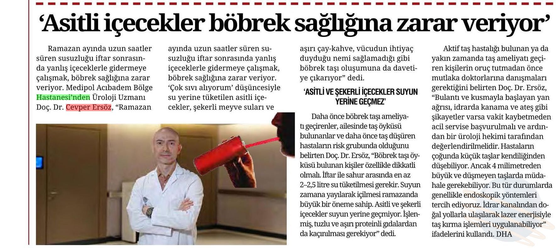 Ramazan ayında uzun süreli susuzluk, böbrek taşı şikayetlerinde artışa neden olabiliyor. Medipol Sağlık Grubu’ndan Üroloji Uzmanı Doç. Dr. Cevper Ersöz, yeterli sıvı tüketilmemesinin idrarın koyulaşmasına ve kristal oluşumuna zemin hazırladığını belirtti. Ersöz, iftar ile sahur arasında zamana yayılarak en az 2-2,5 litre su içilmesi gerektiği konusunda uyardı.