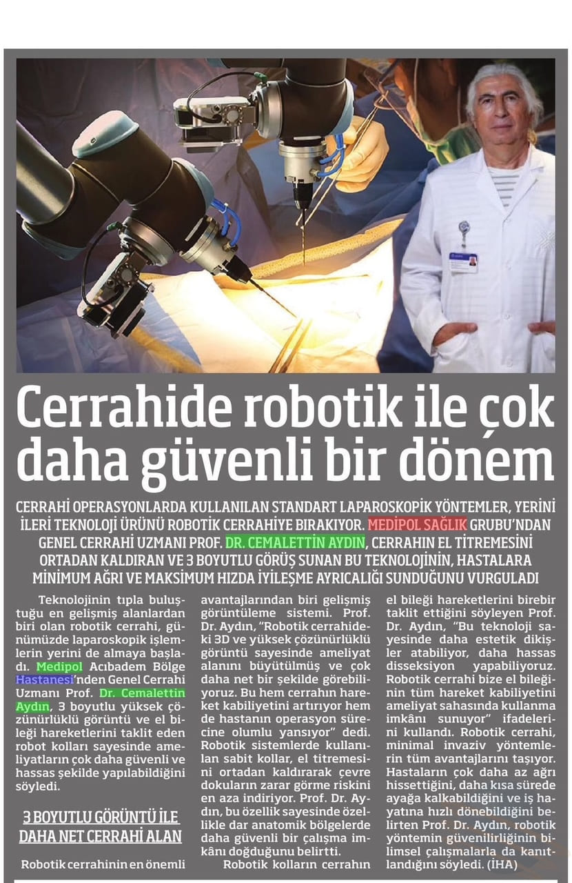 Teknolojinin tıpla buluştuğu en gelişmiş alanlardan biri olan robotik cerrahi, günümüzde laparoskopik işlemlerin yerini de almaya başladı. Medipol Acıbadem Bölge Hastanesi’nden Genel Cerrahi Uzmanı Prof. Dr. Cemalettin Aydın, 3 boyutlu yüksek çözünürlüklü görüntü ve el bileği hareketlerini taklit eden robot kolları sayesinde ameliyatların çok daha güvenli ve hassas şekilde yapılabildiğini söyledi.
