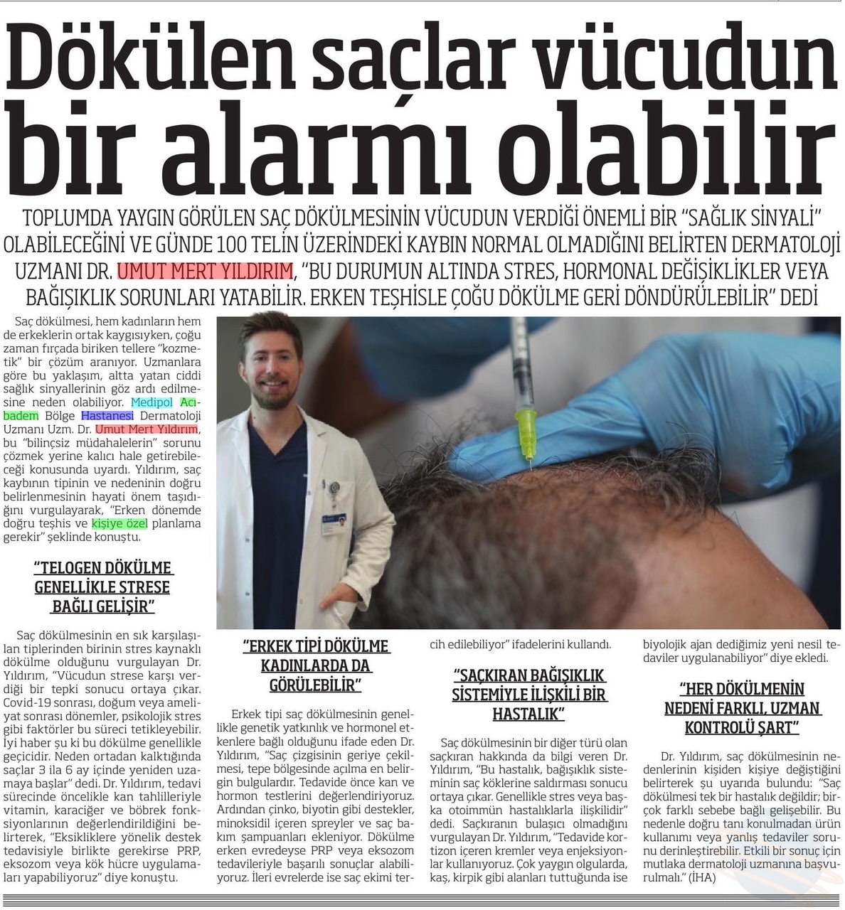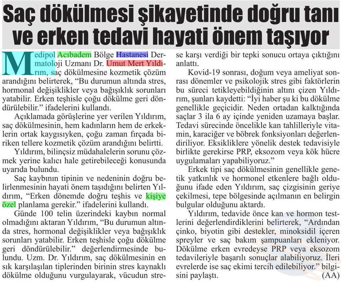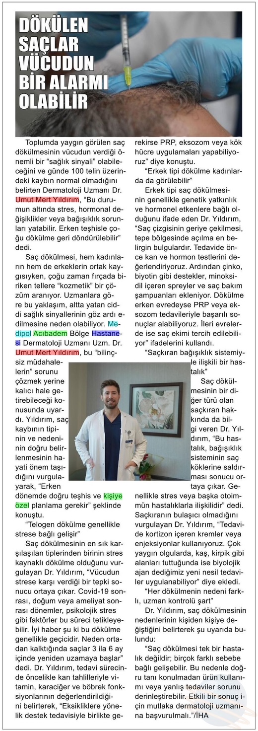 Saç dökülmesinin en sık karşılaşılan tiplerinden birinin stres kaynaklı dökülme olduğunu vurgulayan Dr. Yıldırım, “Vücudun strese karşı verdiği bir tepki sonucu ortaya çıkar. Covid-19 sonrası, doğum veya ameliyat sonrası dönemler, psikolojik stres gibi faktörler bu süreci tetikleyebilir. İyi haber şu ki bu dökülme genellikle geçicidir. Neden ortadan kalktığında saçlar 3 ila 6 ay içinde yeniden uzamaya başlar” dedi. Dr. Yıldırım, tedavi sürecinde öncelikle kan tahlilleriyle vitamin, karaciğer ve böbrek fonksiyonlarının değerlendirildiğini belirterek, “Eksikliklere yönelik destek tedavisiyle birlikte gerekirse PRP, eksozom veya kök hücre uygulamaları yapabiliyoruz” diye konuştu.