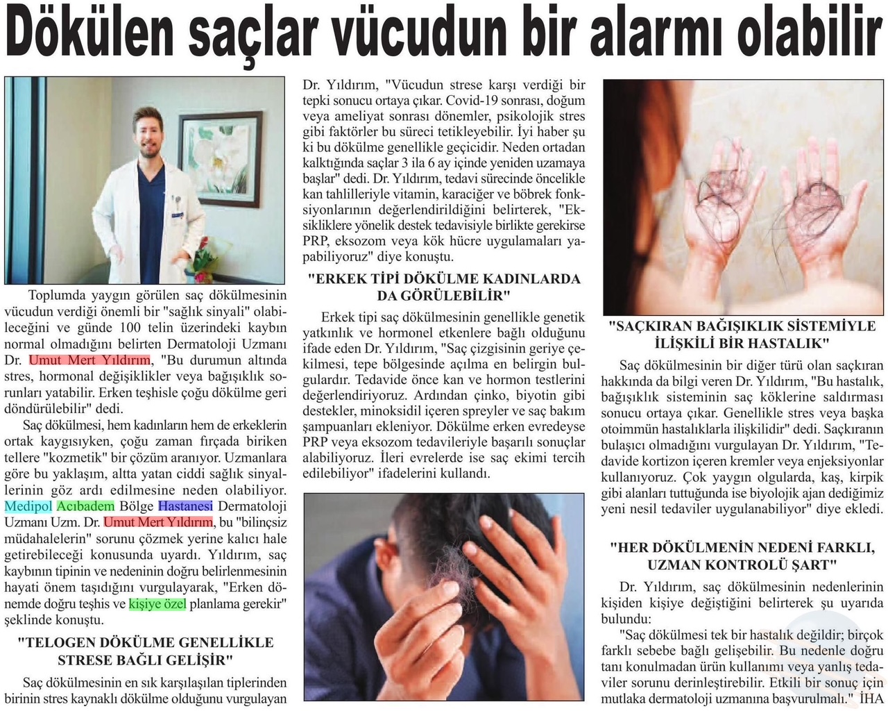 Saç dökülmesi, hem kadınların hem de erkeklerin ortak kaygısıyken, çoğu zaman fırçada biriken tellere “kozmetik” bir çözüm aranıyor. Oysa uzmanlara göre bu yaklaşım, altta yatan ciddi sağlık sinyallerinin göz ardı edilmesine neden olabiliyor. Medipol Acıbadem Bölge Hastanesi Dermatoloji Uzmanı Uzm. Dr. Umut Mert Yıldırım, bu “bilinçsiz müdahalelerin” sorunu çözmek yerine kalıcı hale getirebileceği konusunda uyardı. Yıldırım, saç kaybının tipinin ve nedeninin doğru belirlenmesinin hayati önem taşıdığını vurgulayarak, “Erken dönemde doğru teşhis ve kişiye özel planlama gerekir.” şeklinde konuştu.