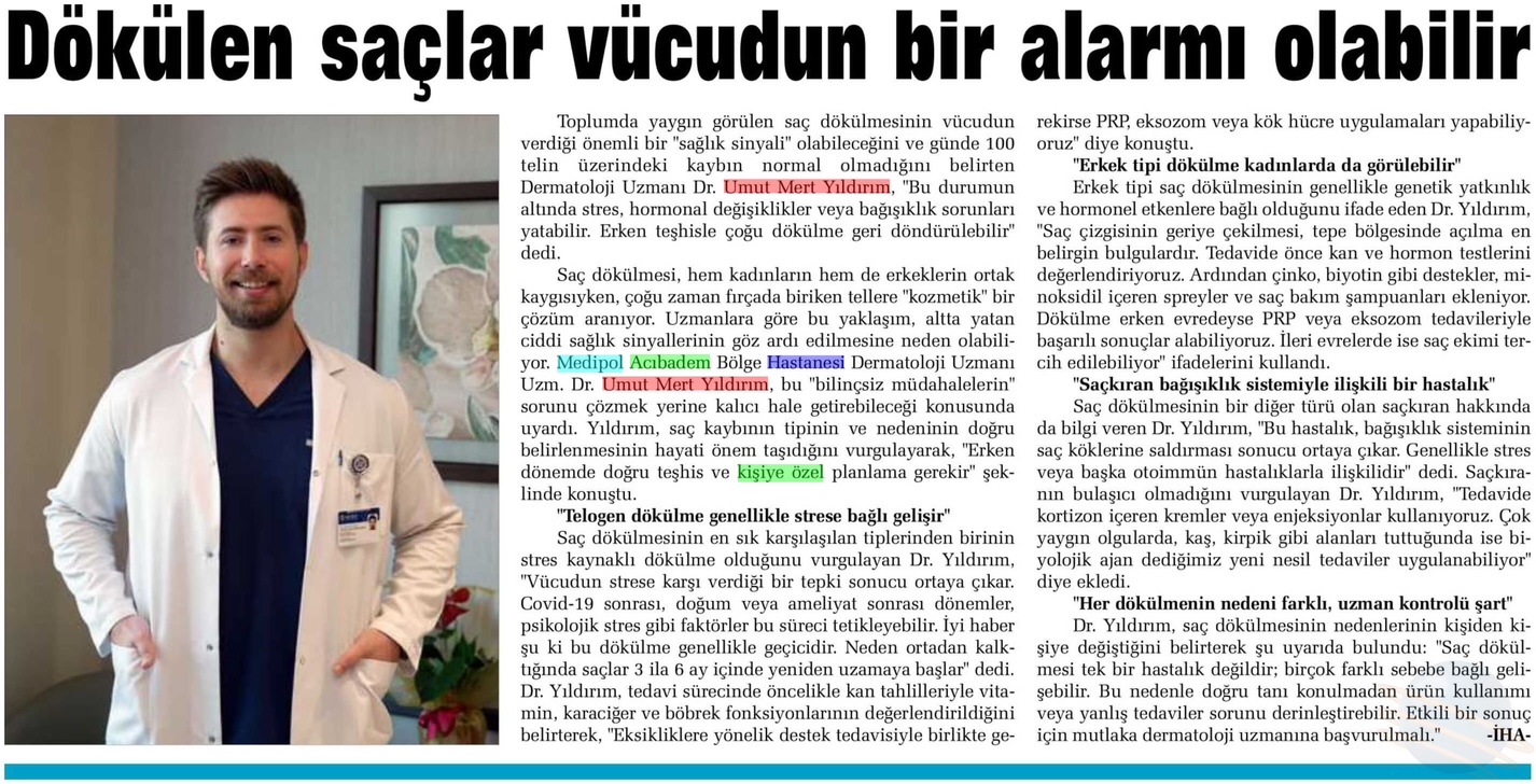 Toplumda yaygın görülen saç dökülmesi, estetik bir kaygıdan öte, vücudun verdiği önemli bir “sağlık sinyali” olabilir. Medipol Sağlık Grubu’ndan Dermatoloji Uzmanı Uzm. Dr. Umut Mert Yıldırım, günde 100 telin üzerindeki kaybın normal olmadığını belirterek, “Bu durumun altında stres, hormonal değişiklikler veya bağışıklık sorunları yatabilir. Erken teşhisle çoğu dökülme geri döndürülebilir” dedi.