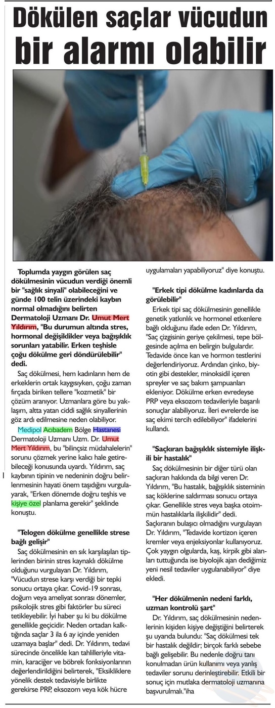 “Saç dökülmesi tek bir hastalık değildir; birçok farklı sebebe bağlı gelişebilir. Bu nedenle doğru tanı konulmadan ürün kullanımı veya yanlış tedaviler sorunu derinleştirebilir. Etkili bir sonuç için mutlaka dermatoloji uzmanına başvurulmalı.”