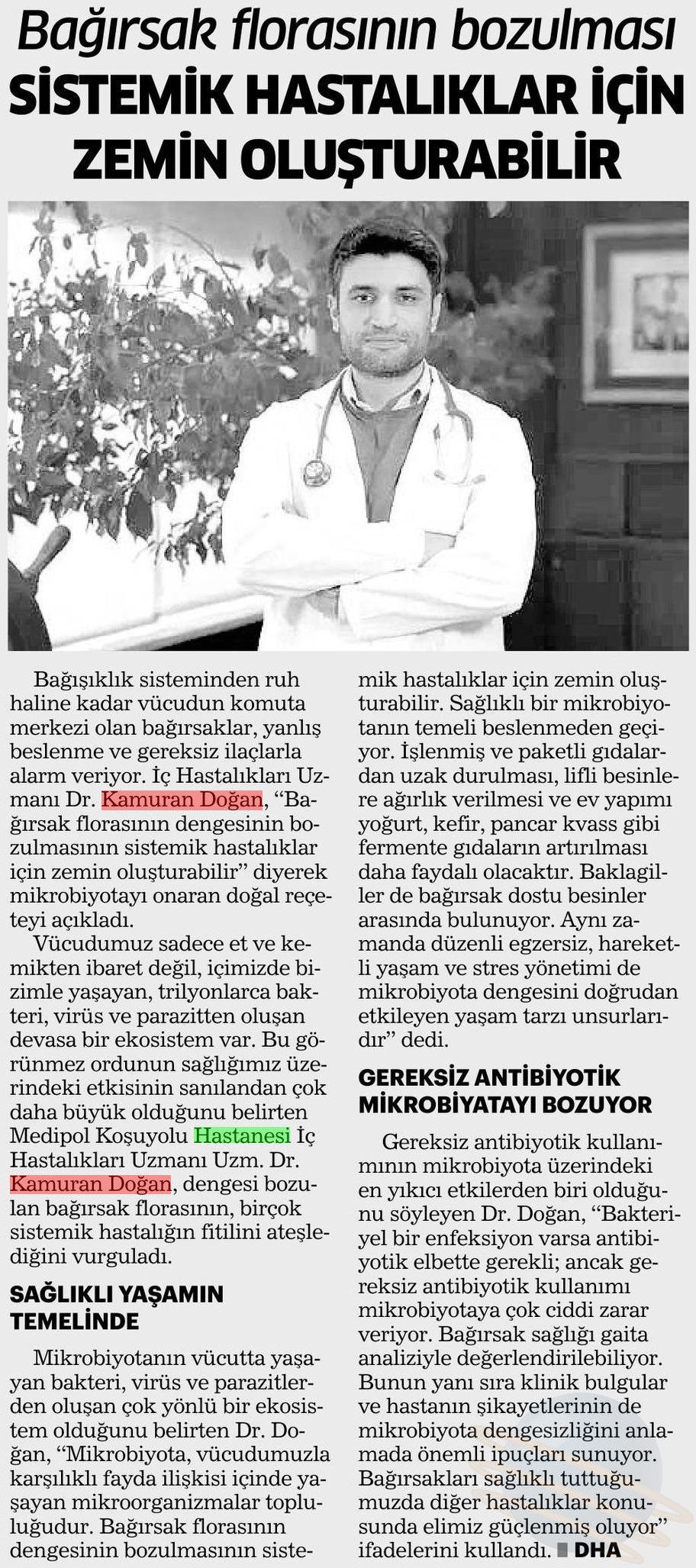 Mikrobiyotanın vücutta yaşayan bakteri, virüs ve parazitlerden oluşan çok yönlü bir ekosistem olduğunu belirten Dr. Doğan, “Mikrobiyota, vücudumuzla karşılıklı fayda ilişkisi içinde yaşayan mikroorganizmalar topluluğudur. Bağırsak florasının dengesinin bozulmasının sistemik hastalıklar için zemin oluşturabilir. Sağlıklı bir mikrobiyotanın temeli beslenmeden geçiyor. İşlenmiş ve paketli gıdalardan uzak durulması, lifli besinlere ağırlık verilmesi ve ev yapımı yoğurt, kefir, pancar kvass gibi fermente gıdaların artırılması daha faydalı olacaktır. Baklagiller de bağırsak dostu besinler arasında bulunuyor. Aynı zamanda düzenli egzersiz, hareketli yaşam ve stres yönetimi de mikrobiyota dengesini doğrudan etkileyen yaşam tarzı unsurlarıdır” dedi.