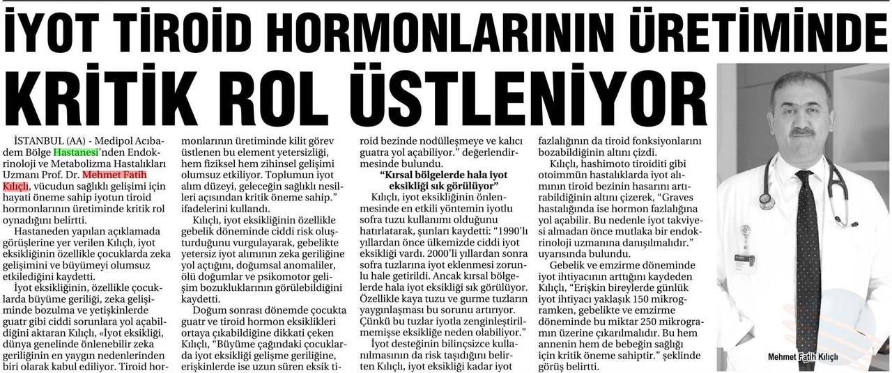 Vücudun sağlıklı gelişimi için hayati öneme sahip olan iyot, tiroid hormonlarının üretiminde temel rol oynuyor. Ancak iyot eksikliği, özellikle çocuklarda büyüme geriliği, zekâ gelişiminde bozulma ve yetişkinlerde guatr gibi ciddi sorunlara yol açabiliyor. 21 Ekim Küresel İyot Eksikliği Bozukluklarını Önleme Günü’nde önemli uyarılarda bulunan Medipol Sağlık Grubu’ndan Endokrinoloji ve Metabolizma Hastalıkları Uzmanı Prof. Dr. Mehmet Fatih Kılıçlı, toplumda yeterli iyot alımının hayati önem taşıdığını vurguladı.