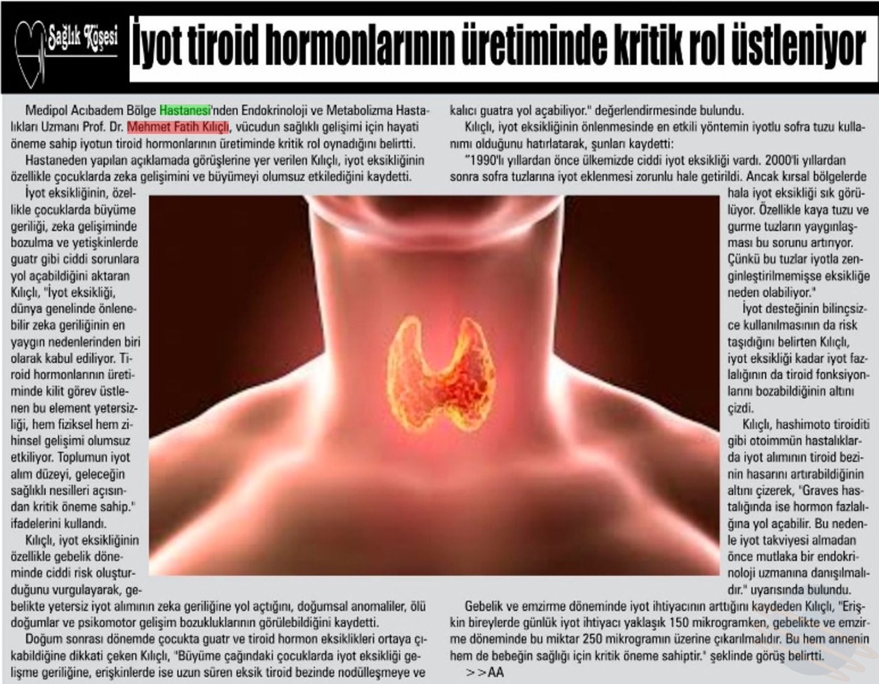 İyot desteğinin bilinçsizce kullanılmasının da risk taşıdığını belirten Prof. Dr. Kılıçlı, “İyot eksikliği kadar iyot fazlalığı da tiroid fonksiyonlarını bozabilir. Hashimoto tiroiditi gibi otoimmün hastalıklarda iyot alımı, tiroid bezinin hasarını artırabilir. Graves hastalığında ise hormon fazlalığına yol açabilir. Bu nedenle iyot takviyesi almadan önce mutlaka bir endokrinoloji uzmanına danışılmalıdır.”