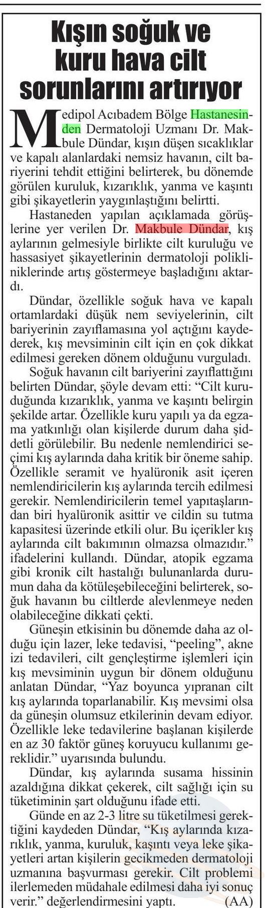 Atopik egzama gibi kronik cilt hastalığı bulunanlarda durumun daha da kötüleşebileceğini belirten Dr. Dündar, “Soğuk hava bu ciltlerde alevlenmeye neden olabilir. Güneşin etkisi bu dönemde daha az olduğu için lazer, leke tedavisi, peeling, akne izi tedavileri, cilt gençleştirme işlemleri için kış uygun bir dönemdir. Yaz boyunca yıpranan cilt kış aylarında toparlanabilir. Kış mevsimi olsa da güneşin olumsuz etkilerinin devam ediyor. Özellikle leke tedavilerine başlanan kişilerde en az 30 faktör güneş koruyucu kullanımı gereklidir” ifadelerini kullandı.