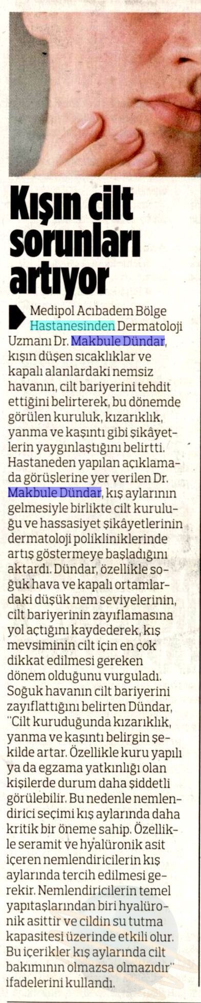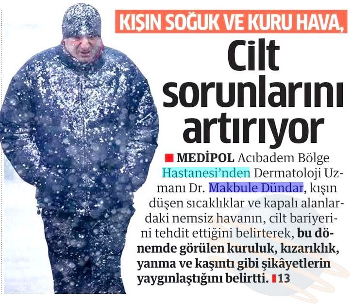 Soğuk havanın cilt bariyerini zayıflattığını belirten Uzm. Dr. Makbule Dündar “Cilt kuruduğunda kızarıklık, yanma ve kaşıntı belirgin şekilde artar. Özellikle kuru yapılı ya da egzama yatkınlığı olan kişilerde durum daha şiddetli görülebilir. Bu nedenle nemlendirici seçimi kış aylarında daha kritik bir öneme sahip. Özellikle seramit ve hyalüronik asit içeren nemlendiricilerin kış aylarında tercih edilmesi gerekir. Nemlendiricilerin temel yapıtaşlarından biri hyalüronik asittir ve cildin su tutma kapasitesi üzerinde etkili olur. Bu içerikler kış aylarında cilt bakımının olmazsa olmazıdır.” dedi.