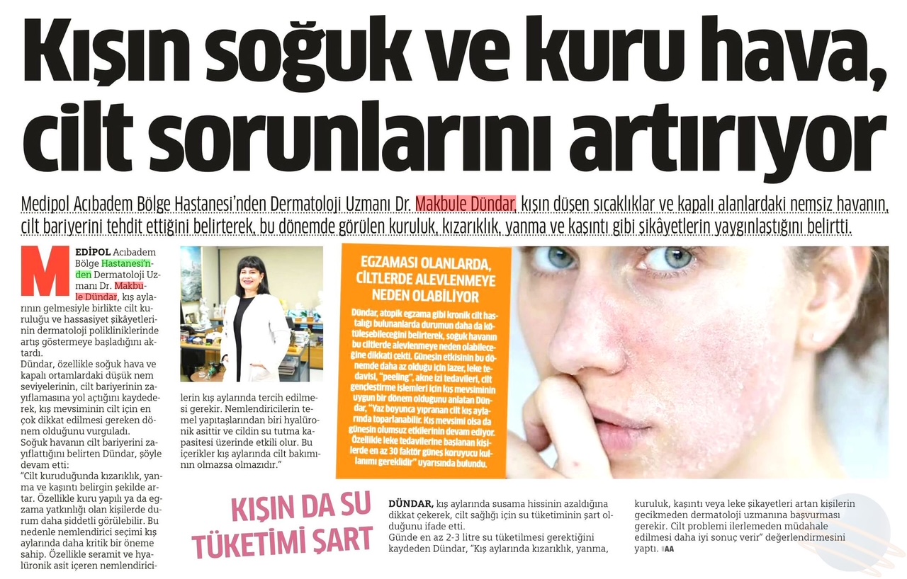 Kış aylarında susama hissinin azaldığına dikkat çeken Dr. Makbule Dündar, “Cilt sağlığı için su tüketimi şart. Günde en az 2-3 litre su tüketilmelidir. Kış aylarında kızarıklık, yanma, kuruluk, kaşıntı veya leke şikayetleri artan kişilerin gecikmeden dermatoloji uzmanına başvurması gerekir. Cilt problemi ilerlemeden müdahale edilmesi daha iyi sonuç verir” şeklinde konuştu.