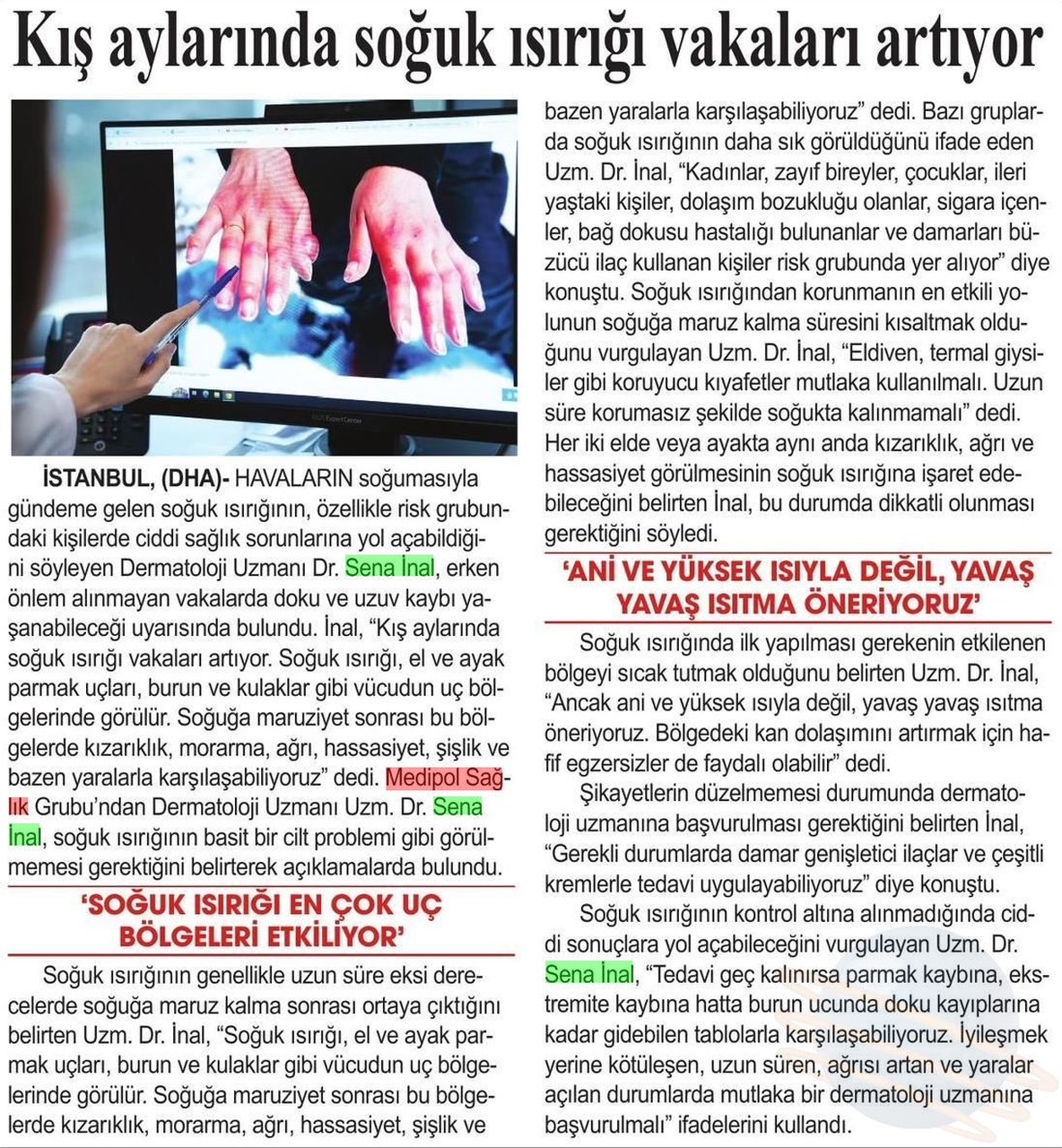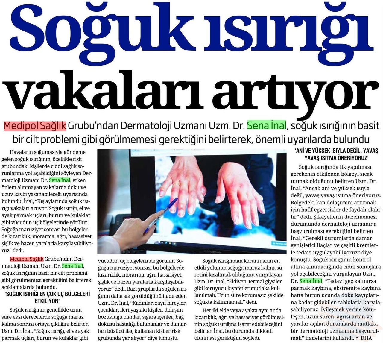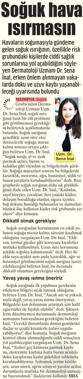 Soğuk ısırığında ilk yapılması gerekenin etkilenen bölgeyi sıcak tutmak olduğunu belirten Uzm. Dr. İnal, “Ancak ani ve yüksek ısıyla değil, yavaş yavaş ısıtma öneriyoruz. Bölgedeki kan dolaşımını artırmak için hafif egzersizler de faydalı olabilir” dedi. Şikayetlerin düzelmemesi durumunda dermatoloji uzmanına başvurulması gerektiğini belirten İnal, “Gerekli durumlarda damar genişletici ilaçlar ve çeşitli kremlerle tedavi uygulayabiliyoruz” diye konuştu. Soğuk ısırığının kontrol altına alınmadığında ciddi sonuçlara yol açabileceğini vurgulayan Uzm. Dr. Sena İnal, “Tedavi geç kalınırsa parmak kaybına, ekstremite kaybına hatta burun ucunda doku kayıplarına kadar gidebilen tablolarla karşılaşabiliyoruz. İyileşmek yerine kötüleşen, uzun süren, ağrısı artan ve yaralar açılan durumlarda mutlaka bir dermatoloji uzmanına başvurulmalı” uyarısında bulundu.