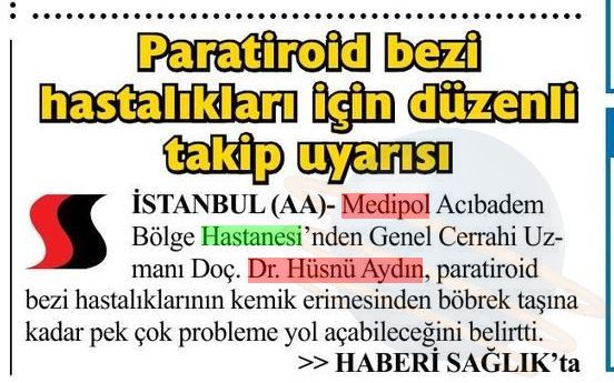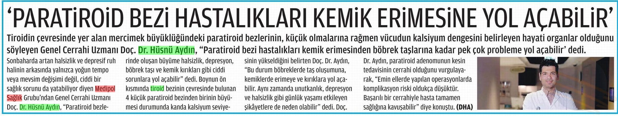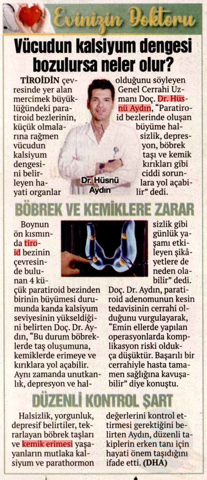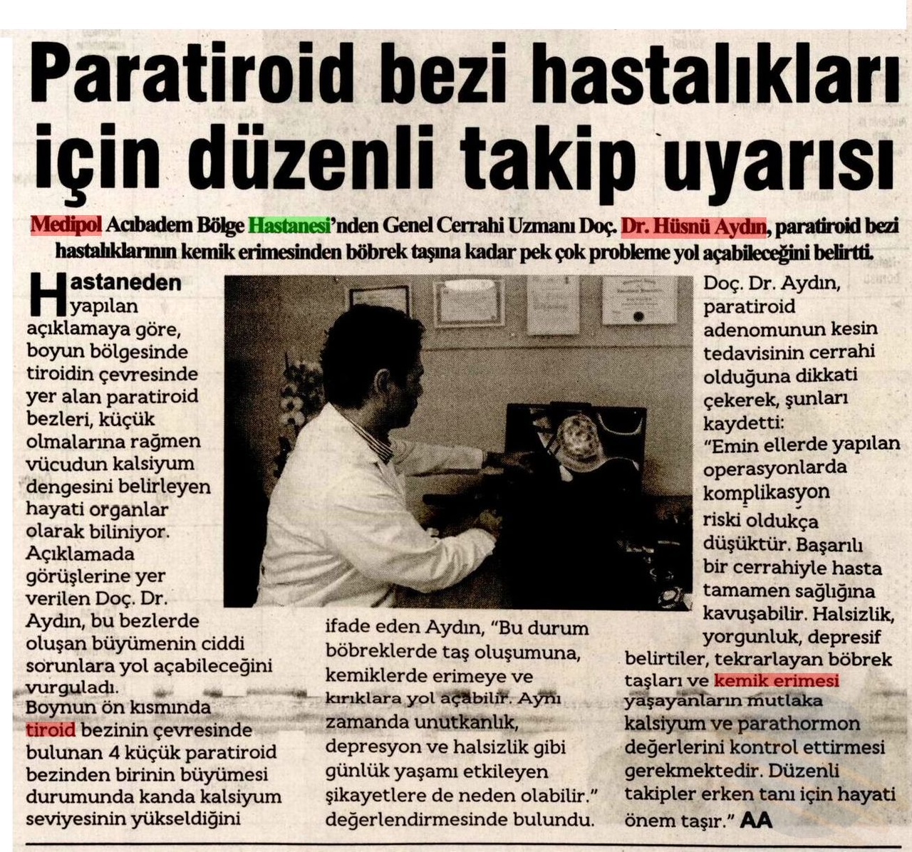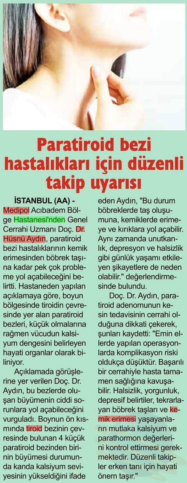 Boynun ön kısmında tiroid bezinin çevresinde bulunan 4 küçük paratiroid bezinden birinin büyümesi durumunda kanda kalsiyum seviyesinin yükseldiğini belirten Doç. Dr. Aydın, “Bu durum böbreklerde taş oluşumuna, kemiklerde erimeye ve kırıklara yol açabilir. Aynı zamanda unutkanlık, depresyon ve halsizlik gibi günlük yaşamı etkileyen şikâyetlere de neden olabilir” dedi. Doç. Dr. Aydın, paratiroid adenomunun kesin tedavisinin cerrahi olduğunu vurgulayarak, “Emin ellerde yapılan operasyonlarda komplikasyon riski oldukça düşüktür. Başarılı bir cerrahiyle hasta tamamen sağlığına kavuşabilir” diye belirtti.